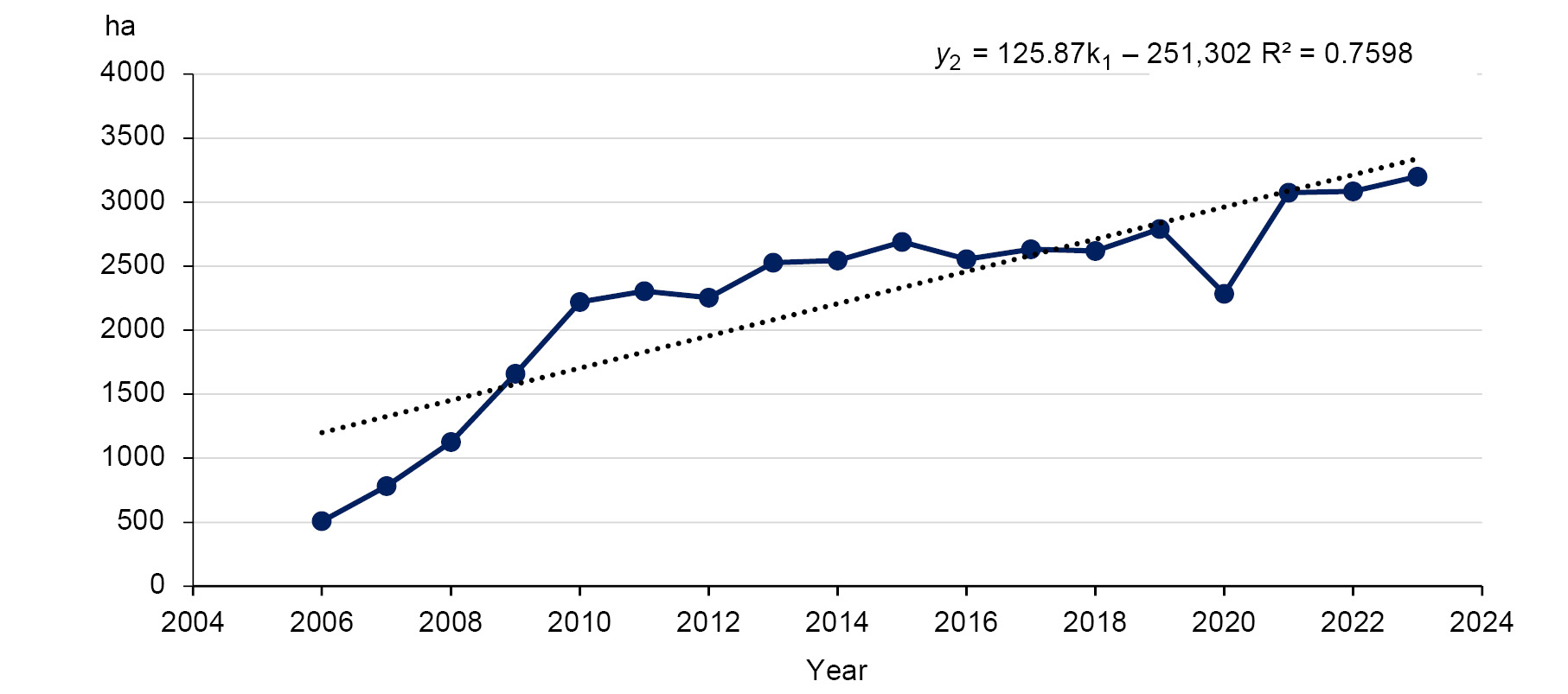 Fig. 3. The volume of acaricide treatments in the Kirov region in 2006–2023.