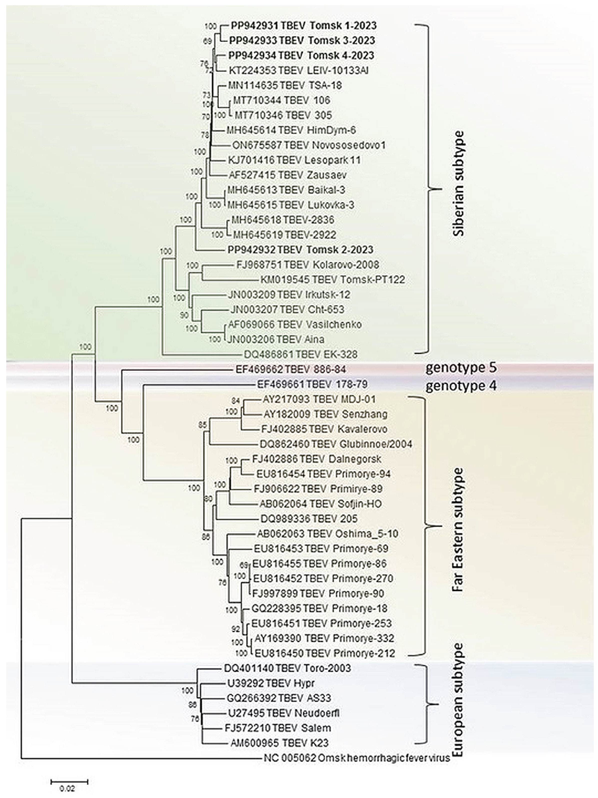 Sanger sequencing reaction was performed using the Big Dye Terminator Kit v. 3.1 (Thermo Fisher Scientific). Nucleotide sequences were determined for both strands using a 3130xl Genetic Analyzer automated sequencer (Applied Biosystems), and all nucleotide sequences were determined twice in independent experiments. Whole genome sequencing of identified TBEV isolates was performed using MiSeq technology and appropriate MiSeq reagent kits v2 (Illumina) by analyzing overlapping specific fragments after PCR. Sequence assembly was performed by mapping reads to the reference genome of Zausaev strain (AF527415) with contigs determination using the Geneious Prime program (2024.0.5).