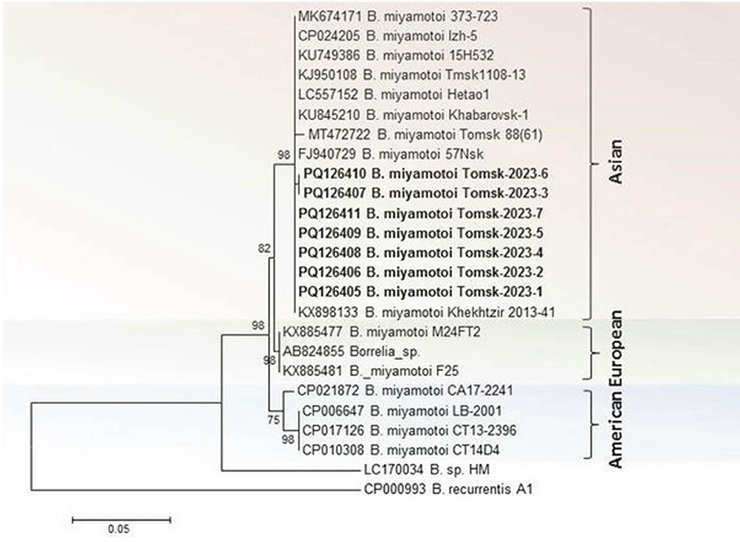 B. miyamotoi DNA was detected in 2.1% of the examined ticks of the Ixodes genus. This species of Borrelia belongs to the causative agents of tick-borne relapsing fevers, which are widespread in various regions of the world, including Russia [25–28]. This species of borrelia is associated with erythematous forms of ITB, while the pathogen is capable of causing severe forms of disease, including meningoencephalitis, in immunocompromised people, and mixt-infections with other tick-borne pathogens. Infection of ixodid ticks with B. miyamotoi is usually much lower than with Borrelia of other species and ranges from 0.3–16% [27, 28]. In 2023, we were unable to detect B. miyamotoi DNA in ixodid ticks of the Dermacentor genus, although in 2021 in the Tomsk region it was detected in 2% of D. reticulatus ticks [3]. Phylogenetic analysis of 7 B. miyamotoi isolates based on the glpQ gene fragment showed that all of them form a rather compact genetic group within the Asian subtype and cluster together with the previously detected variants in the Tomsk, Novosibirsk Regions, Khabarovsk and Krasnoyarsk Krai.