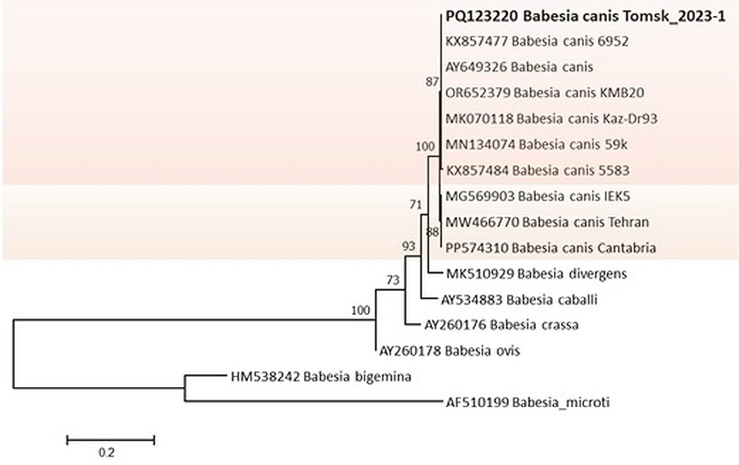 Рис. 6. Филогенетическое дерево, построенное по фрагменту гена 18S рибосомальной РНК (394 п.н.) выявленного изолята В. canis.