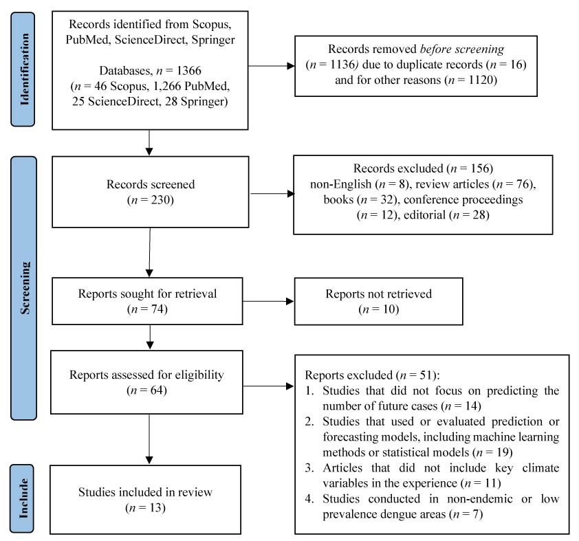 Various forecasting models have been developed over the years, integrating epidemiological, environmental, and climatic variables. While some models rely on traditional statistical methods such as Autoregressive Integrated Moving Average (ARIMA) and Poisson regression [14, 22–24]. Emerging research highlights the superior accuracy of machine learning models, particularly random forest and Long Short Term Memory (LSTM) [25, 26]. However, there is still no consensus on the most effective forecasting approach. To address this research gap, several recent studies have explored novel methodologies in dengue forecasting. Recent studies indicate that integrating deep learning techniques, such as LSTM and transformer models, significantly improves prediction accuracy compared to conventional statistical models [27]. Furthermore, recent findings suggest that incorporating real-time meteorological and mobility data improves forecasting precision [28]. These updated approaches not only improve prediction accuracy but also enhance model adaptability across different geographical regions. Despite these advancements, inconsistencies in data quality, limited external validation, and computational constraints continue to pose challenges in real-world applications. This review focuses on determining which model exhibits the highest accuracy and examining its internal and external validity. Its objective is to synthesize recent literature on dengue case forecasting, discuss related evidence, and evaluate different models' forecasting performance to identify the most effective one.