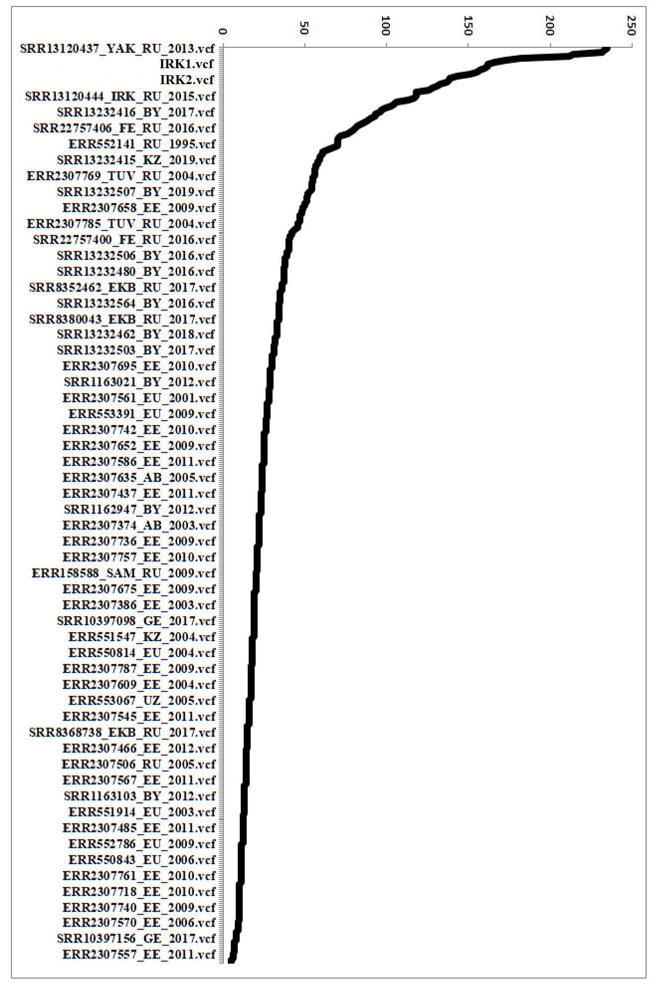 Тестируемые геномы Irk1 и Irk2 занимают наиболее высокие позиции по значениям гетерорезистентности (214 и 212) в позиции 761155 (нуклеотидная замена rpoB — S450L; рисунок). Наибольшая гетерорезистентность (235), выражающаяся в наличии альтернативных коротких прочтений при WGS на исследуемую позицию, наблюдалась только у одного генома из Якутии, выделенного в 2013 г. Проведено исследование вероятности появления обнаруженных замен аминокислот в гене rpoC с использованием двух подходов: PAM-матриц (Point Accepted Mutation matrices) — PAM30 и PAM250 [9] и алгоритма SIFT (Sorting Intolerant From Tolerant) [10]. Для предсказания аминокислотных замен, влияющих на функцию белка, PAM-матрицы использовали для оценки вероятности замены аминокислот в процессе эволюции [9]. Алгоритмом SIFT определяли, влияют ли аминокислотные замены на функцию белка, используя эволюционную информацию и выравнивание гомологичных последовательностей [10].