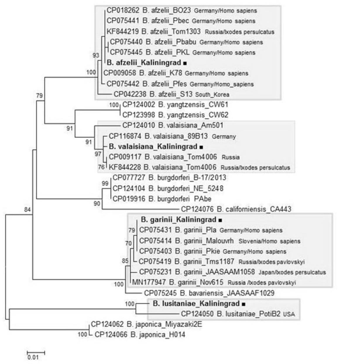 Tick-borne borrelioses occupy an important place in the structure of infectious pathology in the Kaliningrad region. In ticks of the Kaliningrad region we detected and genotyped B. afzelii, B. garinii and B. lusitaniae, which are considered pathogenic for humans, and B. valaisiana, the pathogenicity of which is under discussion [21]. The infection rate (15.5%) correlates with earlier studies in the Leningrad and Kaliningrad regions [12]. B. afzelii and B. garinii are the most common pathogens of tick-borne borreliosis in humans and are most often found in I. ricinus ticks. Circulation of B. lusitaniae was shown for the first time in the territory of the Kaliningrad region. It should be noted that B. lusitaniae is mainly distributed in the countries of the Mediterranean region, such as Portugal, Morocco and Tunisia. In more northern latitudes, this pathogen was detected in Austria, Slovakia, Ukraine and Latvia [22].
