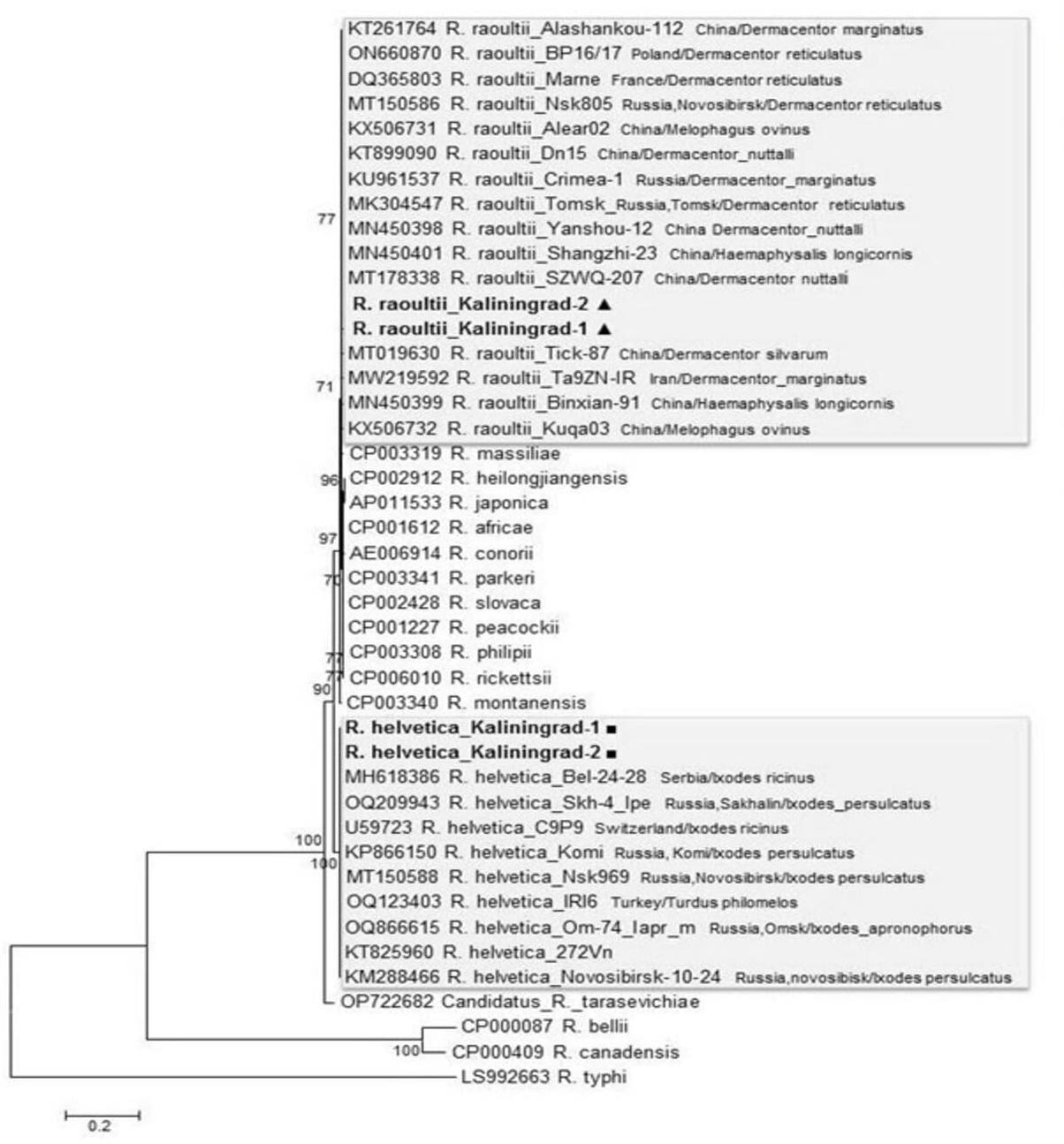 R. conorii subsp. raoultii was described as a new Rickettsia species in 2008 after the study of the prototype strain of R. raoultii isolated in 2005 in Kharbarovsk from D. silvarum ticks in Khabarovsk Krai [28]. In subsequent studies, R. raoultii was detected in D. reticulatus, D. marginatus and D. nuttalli ticks in a number of regions of the Asian part of Russia (Omsk region, Republic of Buryatia), Kazakhstan, China, and Mongolia [19, 20]. Rickettsiae genetically similar to R. raoultii have been identified in Haemaphysalis hystricis ticks in Japan and in H. ornithophila, H. shimoga, and H. lagrangei ticks in Thailand, as well as in D. marginatus ticks in Georgia, Turkey and European countries [29].