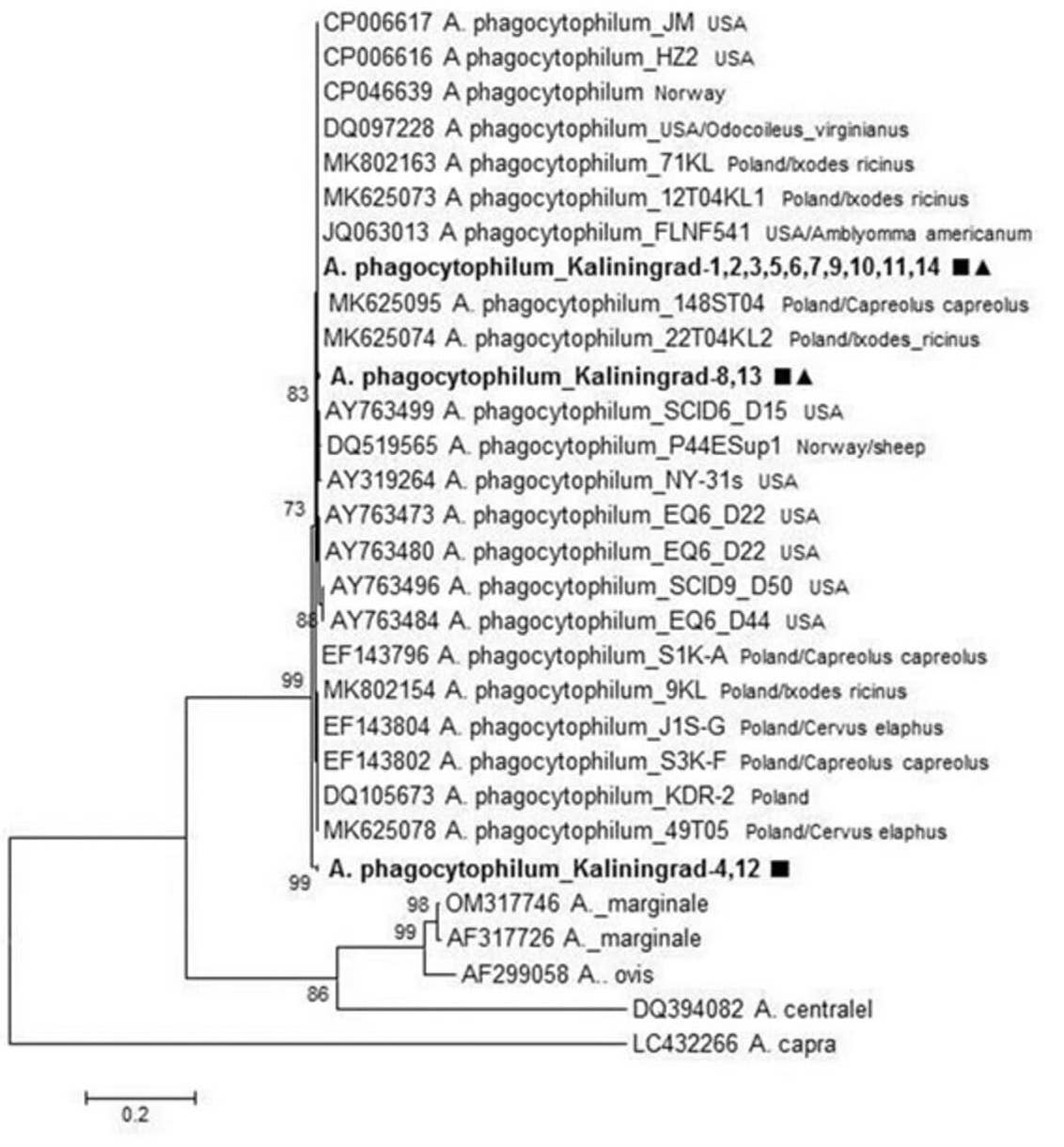 The presence of A. phagocytophilum genetic material in I. ricinus and D. reticulatus ticks, revealed for the first time in this work, shows the active circulation of this pathogen in the Kaliningrad region. The level of infection of D. reticulatus and I. ricinus ticks (0.2% and 1.4%, respectively) corresponds to similar indicators for such countries as Denmark, Sweden, Norway and Germany, where the pathogen is found in 1–5% of ixodid ticks [23]. Phylogenetic analysis shows simultaneous circulation of at least 3 genetic variants of A. phagocytophilum. Human granulocytic anaplasmosis (HGA) was first described in the Russian Far East in 2000. Later confirmed cases of the disease were reported in Perm and Novosibirsk regions and in Altai. The clinical course of HGA is very polymorphic: from mild, subclinical forms to extremely severe, fatal cases, which account for 0.5–1.0% and are usually associated with the development of secondary infections. The disease is characterized by the appearance of headaches and muscle aches, the development of fever. Less than half of patients may have nausea, vomiting, anorexia, diarrhea, abdominal and joint pain, cough. In most cases, leukopenia, thrombocytopenia, and elevated serum levels of liver aminotransferases and C-reactive protein are noted in HGA patients. HGA disease has not been registered in the Kaliningrad region.