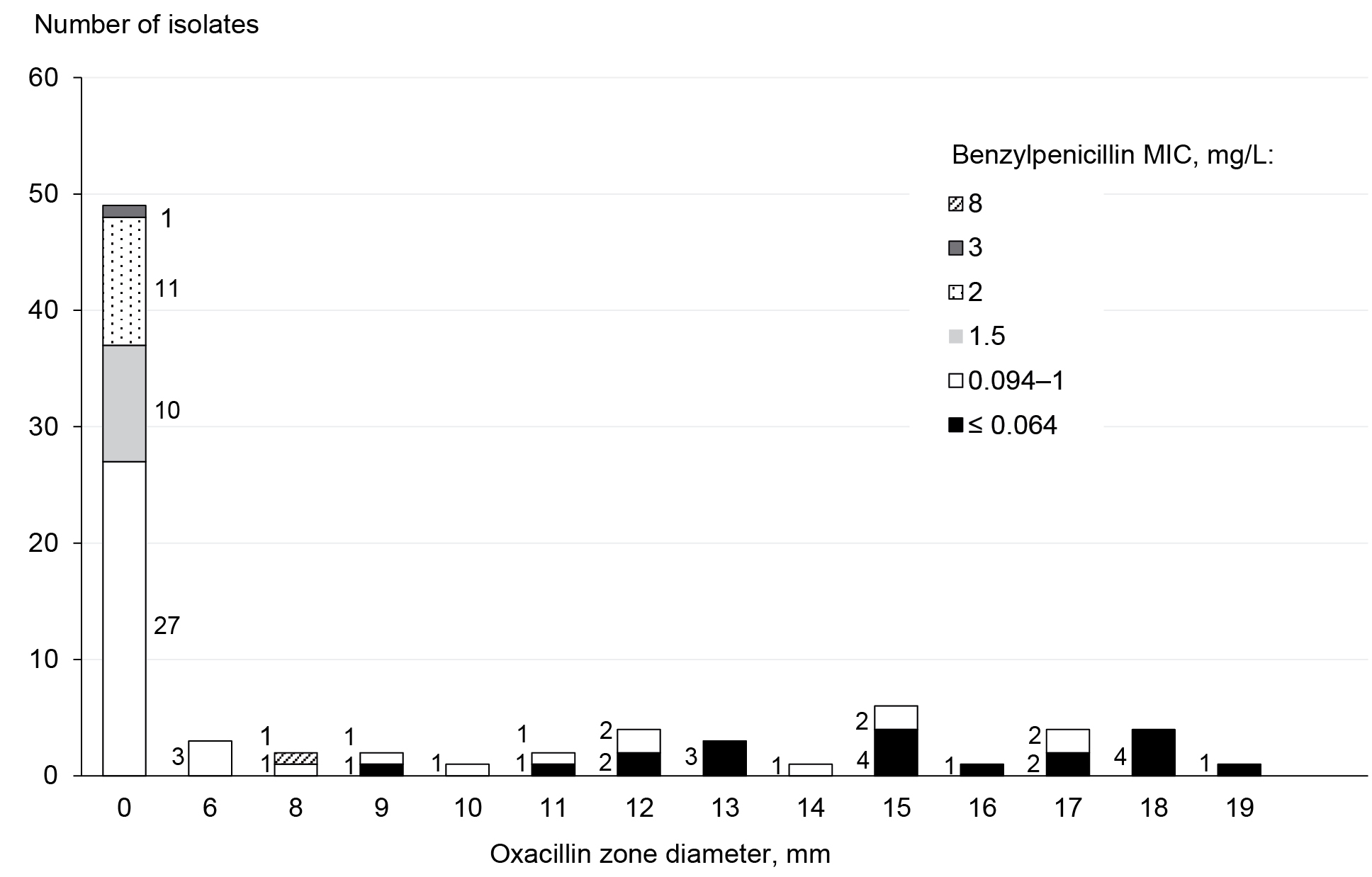 To exclude β-lactam resistance mechanisms, screening with a 1 μg oxacillin disk was performed. If a zone of growth inhibition around the oxacillin disk was greater than 20 mm, the isolate was considered susceptible to all β-lactams. If the zone diameter was less than 20 mm, the isolate was considered resistant to phenoxymethylpenicillin. The diameter of the zone, 9–19 mm, indicated susceptibility to ampicillin, amoxicillin, piperacillin, cefepime, cefotaxime, ceftaroline, ceftobiprole, ceftriaxone, imipenem and meropenem. For inhibition zone diameters less than 9 mm, the minimum inhibitory concentration (MIC) of all β-lactam antibiotics was required. Accordingly, the MIC of benzylpenicillin was determined for all isolates with a zone diameter of less than 20 mm, and for cultures with a zone diameter of less than 9 mm, the MIC of amoxicillin, ceftriaxone, and imipenem was also determined. E-tests (bioMerieux) were used in this study5. Isolates with an MIC greater than 1 mg/L for penicillin and amoxicillin, and greater than 2 mg/L for ceftriaxone and imipenem (according to criteria for infections other than endocarditis and meningitis) were considered resistant.