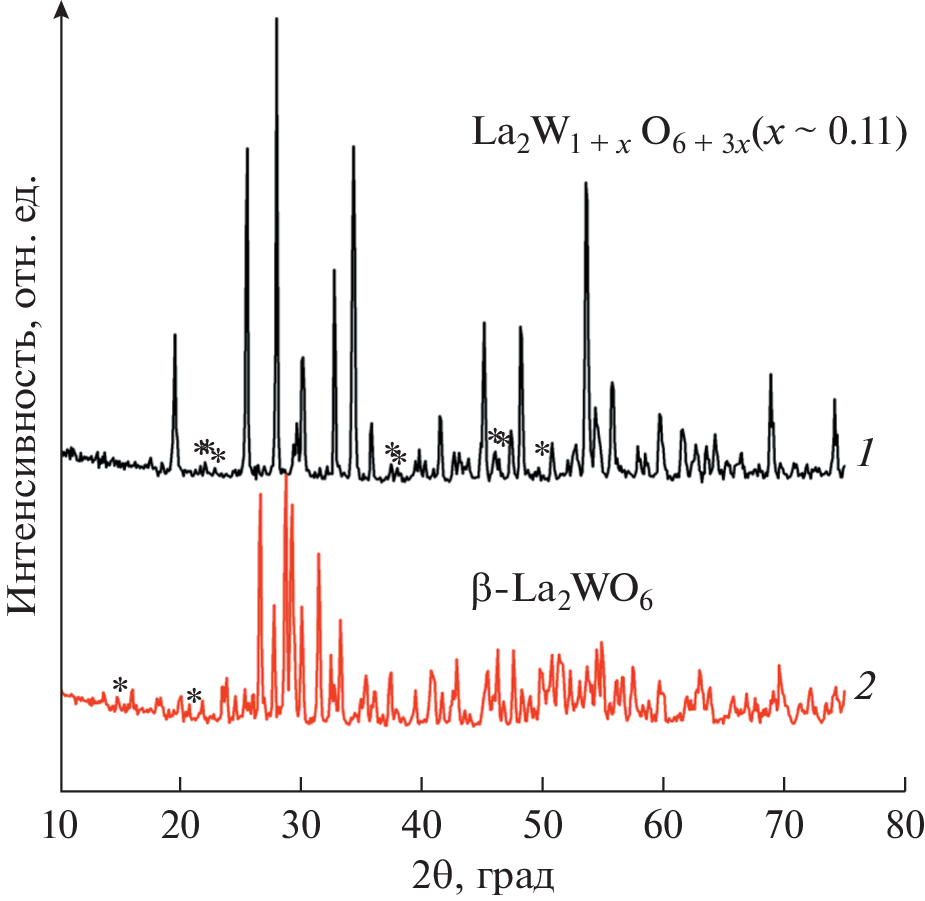 The hexagonal solid solution La2W1 + xO6 + 3x (x ~ 0.11) and the orthorhombic low-temperature phase β-La2WO6 (La2W1 + xO6 + 3x (x = 0)) are synthesized by the methods of preliminary mechanical activation of oxides followed by high-temperature synthesis at 1400°С, 4 h. In addition, by using the method of crystallization from solution, a single crystal of the La2W1 + xO6 + 3x (x ~ 0.22) composition isostructural to La2W1 + xO6 + 3x (x ~ 0.11) is grown. Both ceramics and the single crystal are studied by the methods of Raman spectroscopy, thermal analysis, and thermogravimetry. Their conductivity is studied by impedance spectroscopy in dry and humid air. The hexagonal single crystal La2W1 + xO6 + 3x (x ~ 0.22) demonstrates strong luminescence in the IR region, in contrast to the hexagonal ceramics La2W1 + xO6 + 3x (x ~ 0.11) and the β-La2WO6 ceramics with the orthorhombic structure. The polycrystalline La2W1 + xO6 + 3x (x ~ 0.11) ceramics is found to be more stable under redox conditions as compared with the single crystal. The conductivity of the hexagonal single crystal La2W1 + xO6 + 3x (x ~ 0.22) is of the oxygen-ionic nature and lower than the conductivity of ceramics La2W1 + xO6 + 3x (x ~ 0.11) due to its perfect structure. The contribution of the protonic component of conductivity is absent for both the hexagonal solid solution La2W1 + xO6 + 3x (x ~ 0.11) and the single crystal La2W1 + xO6 + 3x (x ~ 0.22), their conductivity being of the purely ionic nature with the close values of activation energy (0.89 and 1.08 eV, respectively). The synthesized β-La2WO6 ceramics demonstrates a small contribution of the protonic conductivity in humid air equal to ~1 × 10–6 S/cm at 600°С, which is close to the conductivity of the earlier studied strontium-doped solid solution La1.96Sr0.04WO6 – δ based on β-La2WO6.
