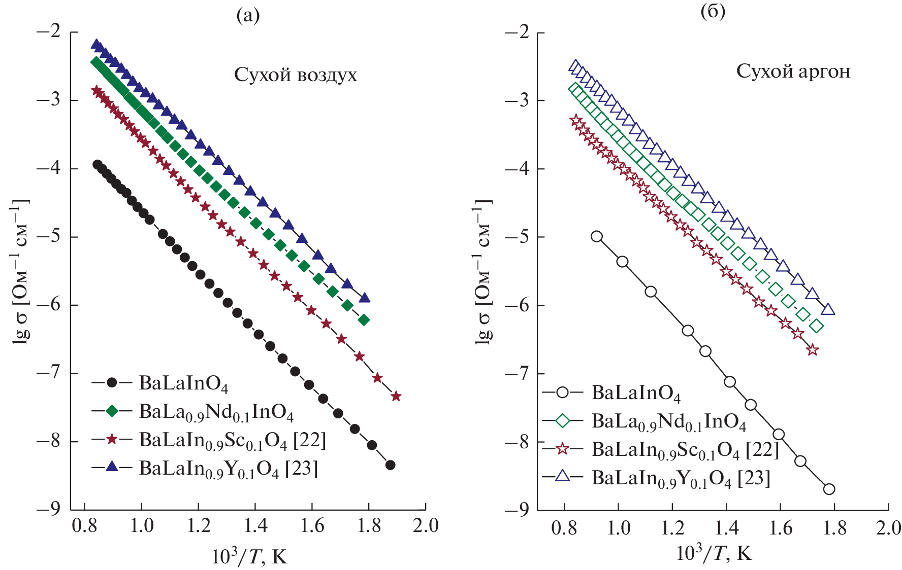 The oxygen-ionic conductivity of isovalent-doped complex oxides characterized by the Ruddlesden–Popper structure is studied. The BaLa0.9Nd0.1InO4 sample was obtained for the first time by substitution in the La sublattice, and its transport properties are studied. A comparing of the results with the data for samples obtained earlier by isovalent substitution in the In-sublattice of BaLaInO4 is presented. The introducing of a dopant is shown to lead to increase in the contribution from oxygen-ionic conductivity and also in the total conductivity by ~2 orders of magnitude.