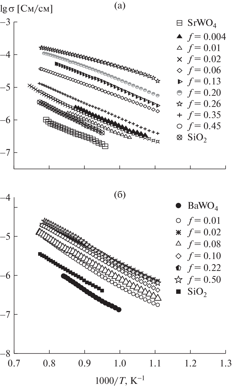 Composite materials (1-f)SrWO4–fSiO2 and (1–f)BaWO4–fSiO2, where f is the volume fraction of the dispersed SiO2 additive, were prepared by the solid-phase method. The resulting composites were studied by XPA, TG-DSC, SEM-EDA. The electrical conductivity of the composites was measured by the electrochemical impedance method as a function of temperature, oxygen partial pressure in the gas phase, and composition. To estimate the contribution of ionic conductivity, the sum of ionic transfer numbers was measured by the EMF method. It has been shown that the addition of 20–25 vol % nano-SiO2 to low-conductivity oxygen-ion conductors SrWO4 and BaWO4 leads to an increase in the ionic conductivity of composites based on them by two orders of magnitude and by 12 times, respectively. The increase in conductivity in the systems under study is explained by the additional contribution of interfacial boundaries formed between the MeWO4 matrix and dispersoid nanoparticles. The mixing rule [1] was used to calculate the electrical conductivity of (1-f)SrWO4–fSiO2 and (1-f)BaWO4–fSiO2 composites depending on the SiO2 content. The calculated concentration dependences of the conductivity obtained are in satisfactory agreement with the experimental results.