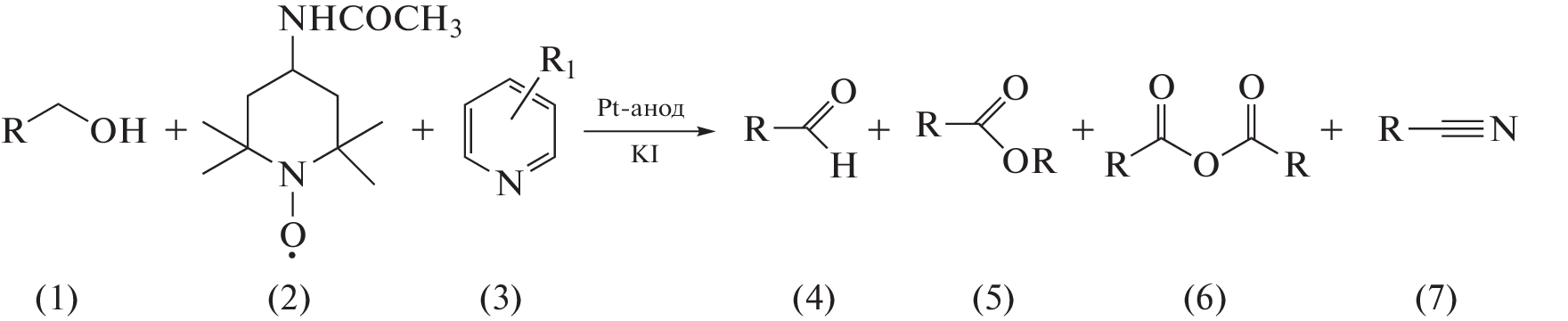 A universal catalytic system 4-acetamido-2,2,6,6-tetramethylpiperidine-1-oxyl/KI/pyridine base for the conversion of alcohols into carbonyl compounds and derivatives of carboxylic acids has been developed. The use of pyridine, 2,6-lutidine or collidine made it possible to obtain carbonyl compounds (yield up to 100%) after 2-2.2 F/mol. In the presence of pyridine, aliphatic alcohols are converted to esters (yield up to 35%) after 3-4 F/mol. Acid anhydrides (yield up to 80%) are formed using 2,6-lutidine or collidine after 5-6 F/mol. Nitriles were obtained in the presence of 2,6-lutidine and a source of nitrogen (yield up to 99%) after 3-4 F/mol.