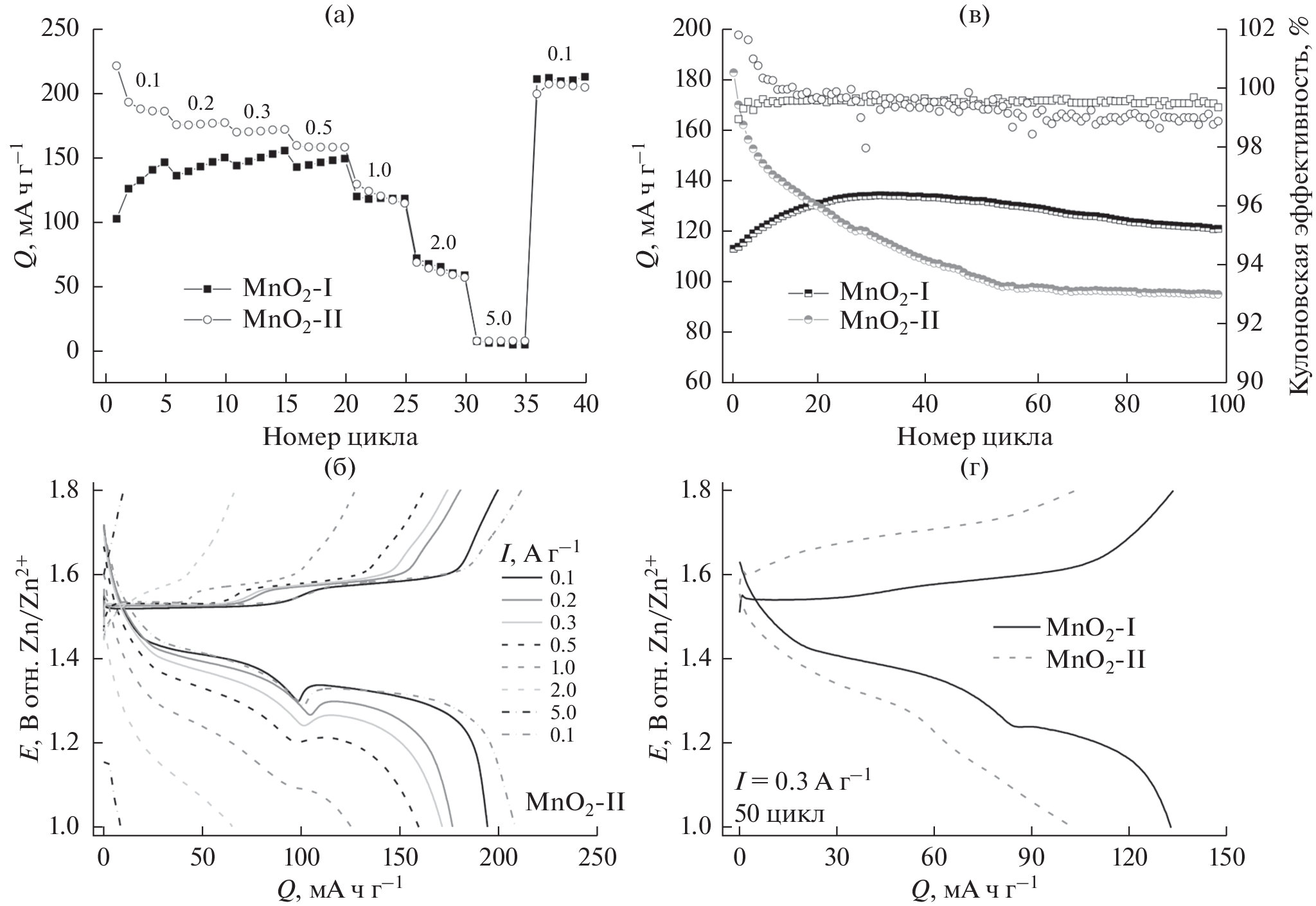 This research presents an analysis of physico-chemical, structural and electrochemical properties of cathode materials for aqueous zinc-ion batteries based on manganese dioxide with birnessite-type structure in dependence on the conditions of hydrothermal synthesis. The manganese oxides obtained are capable to the reversible zin ions intercalation into the crystal lattice because of large interlayer distances. They were considered two approaches of synthesis: a reaction between manganese sulfate and potassium permanganate at 160 °С (MnO2-I) and a hydrothermal treatment of potassium permanganate solution at 220 °С (MnO2-II). From the structural analysis it was shown that both methods allow obtaining the birnessite-type manganese dioxide. At the same time, electrochemical properties of cathodes obtained differ in the models of aqueous zinc-ion batteries. MnO2-II material demonstrate higher initial specific capacity (180 mAh∙g-1 at current density 0.3 A∙g-1) while its cyclic stability is on 40% lower than for MnO2-I material. This can be explained with higher surface area of the active material and lower crystallinity.