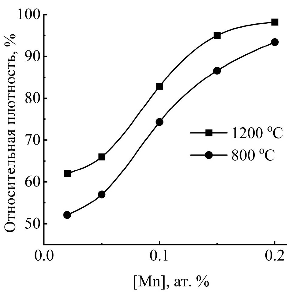 Повышение температуры предварительного отжига до 1200 оC способствует увеличению относительной плотности керамики, при этом большее влияние показано для составов с содержанием Mn до 20 ат.% (рис. 2).