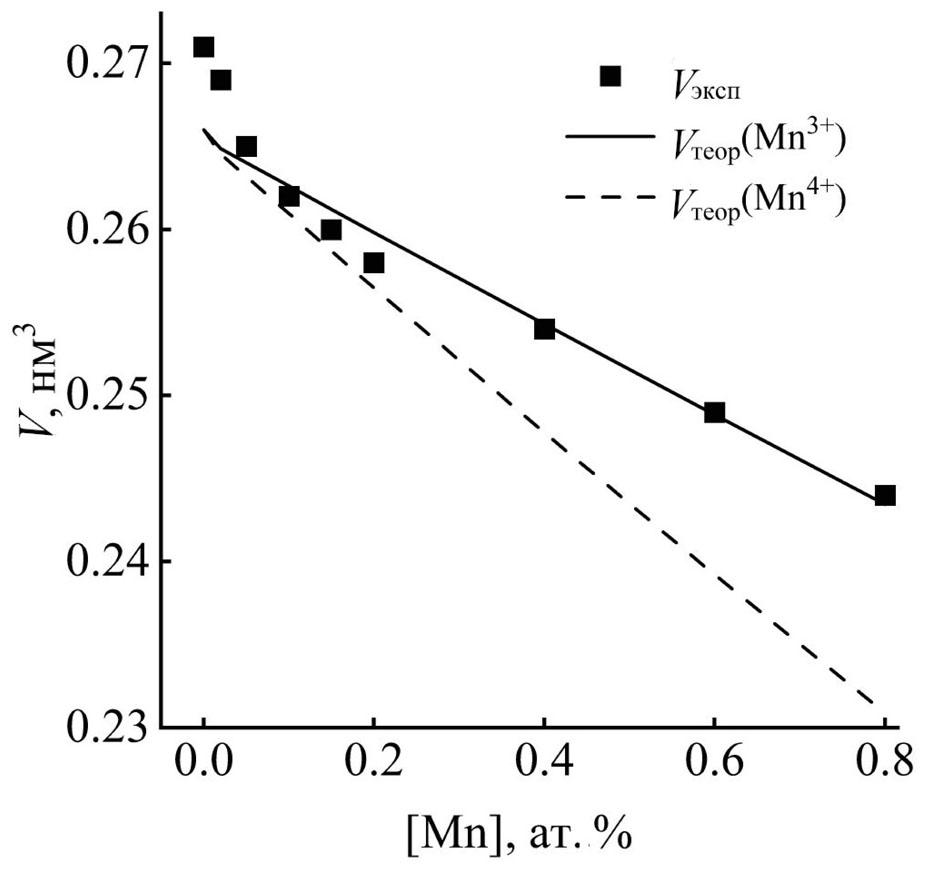 Экспериментальную кривую можно разделить на два участка по характеру наклона: в диапазоне допирования x = 0.05–0.2 экспериментальная кривая ближе к объему ячейки с марганцем +4, а при x = 0.4–0.8 ближе к кривой для марганца +3. Можно предположить, что при низком уровне допирования в исследуемой системе марганец преимущественно находится в степени окисления +4, а для x = 0.4–0.8 степень окисления марганца преимущественно равна +3. Вероятно, изменение значения степени окисления происходит в диапазоне концентраций 0.2–0.4 ат.% Mn. Эти данные требуют уточнения рядом специализированных методов.