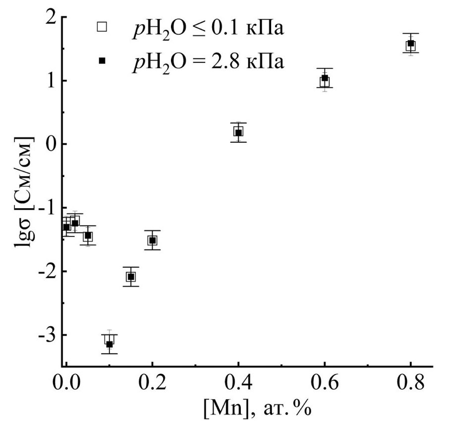 При концентрации Mn 10 ат.% наблюдается резкое падение значений проводимости, дальнейшее увеличение концентрации допанта приводит к существенному увеличению электропроводности, например для LSSM60 и LSSM80 на 3–4 порядка величины. Для составов с большими добавками марганца существенное влияние влажности на уровень проводимости также отсутствует, при этом, согласно уравнению (5), вклад дырочной проводимости доминирует. Нелинейный характер изменения проводимости в зависимости от концентрации марганца в материалах LSSM определяется как дефектностью структуры, так взаимодействием дефектов между собой. Необходимо дальнейшее подробное изучение дефектной структуры LSSM для объяснения природы происходящих процессов.