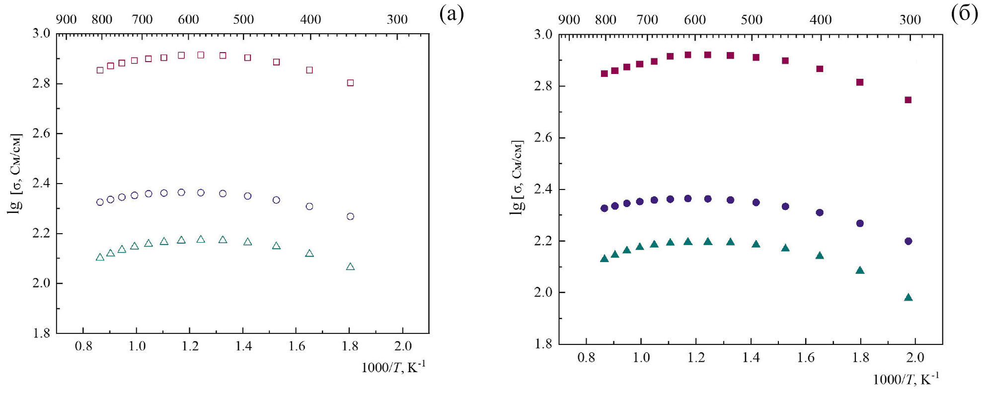 Рис. 6. Температурные зависимости электропроводности композитных материалов в осушенной атмосфере (pH2O = 0.04 кПа) (а) и увлажненной атмосфере (pH2O = 3.2 кПа) (б).