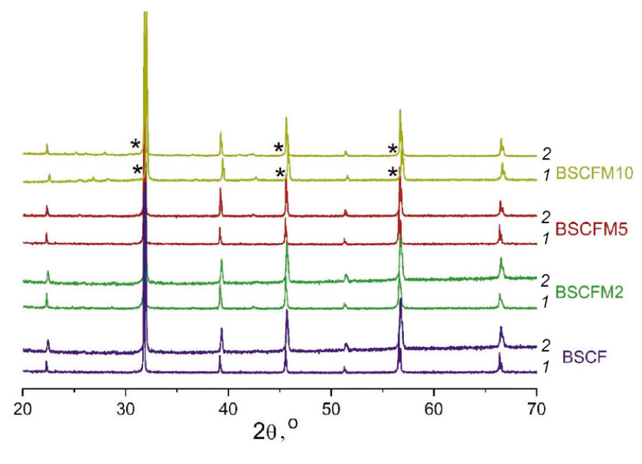 Кристаллическую структуру материалов BSCFMx исследовали на дифрактометре BrukerD8 Advance с высокоскоростным детектором LynxEye (СuKα-излучение). Наборы данных записывали в режиме пошагового сканирования в диапазоне 2θ 10–80о с интервалами 0,02o. Высокотемпературные дифракционные исследования проводились в высокотемпературной камере Anton Paar HTK-1200. Для изменения парциального давления в высокотемпературной камере использовали смесь газов O2/He в различных соотношениях, контролируемых с помощью газового смесителя УФПГС-4. Общий поток газовой смеси составлял 200 мл/мин. Качественный фазовый анализ выполнен с использованием базы данных ICDDPDF-4+ (2011). Уточнение параметров элементарной ячейки образцов BSCFMx проводили методом Ритвельда с использованием программы TOPAS 4.2 (Bruker, Германия) и базы данных ICDDPDF-4+ (2011 г.).