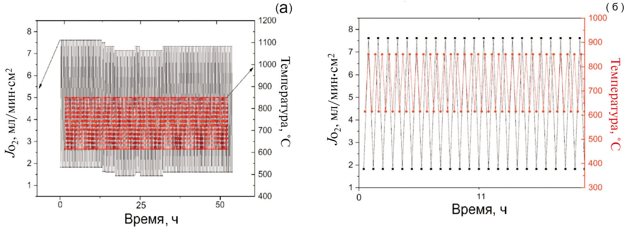 Поскольку нагрев током позволяет осуществлять быстрый нагрев и охлаждение МТ-мембран, в ходе работы были проведены эксперименты по термоциклированию. На рис. 4а и 4б приведены циклы нагрев–охлаждение МТ-мембран состава BSCFM5 в течение ~52 ч со скоростью V = 35o/мин. Как видно из представленных графиков, поток кислорода через МТ-мембраны состава BSCFM5 оставался стабильным на протяжении всего эксперимента и составлял 7.4–7.6 мл см-2мин-1 и 1.7–1.9 мл см-2мин-1 при T = 850 и 600 oС соответственно.