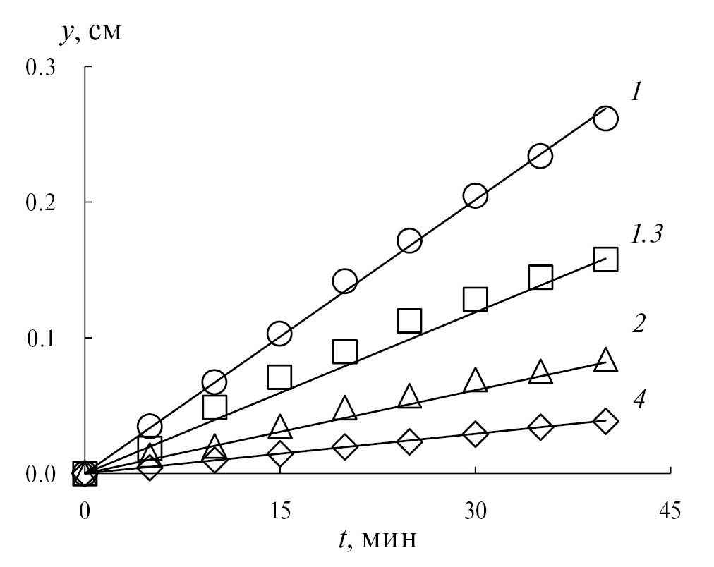 Как в стационарном, так и импульсных режимах задания потенциала осадки цинка в исследованных условиях растут с постоянной скоростью (рис. 4), поэтому для аппроксимации экспериментальных зависимостей y(t) было использовано линейное уравнение вида [25, 26]:
