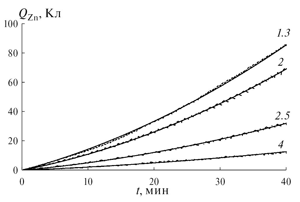 где QZn, c, j, QZn, a, j – катодное и анодное количества электричества, рассчитанные численным интегрированием опытных зависимостей Ic(t) и Ia(t) в j-м цикле, Кл.