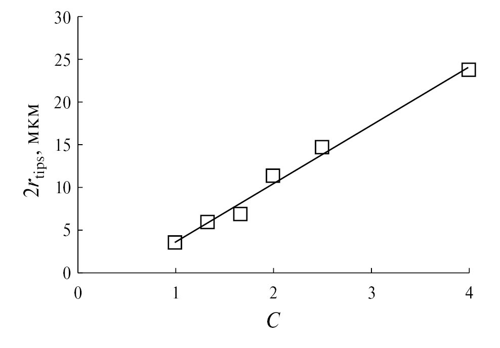Рис. 10. Зависимость диаметра вершин дендритов от скважности.