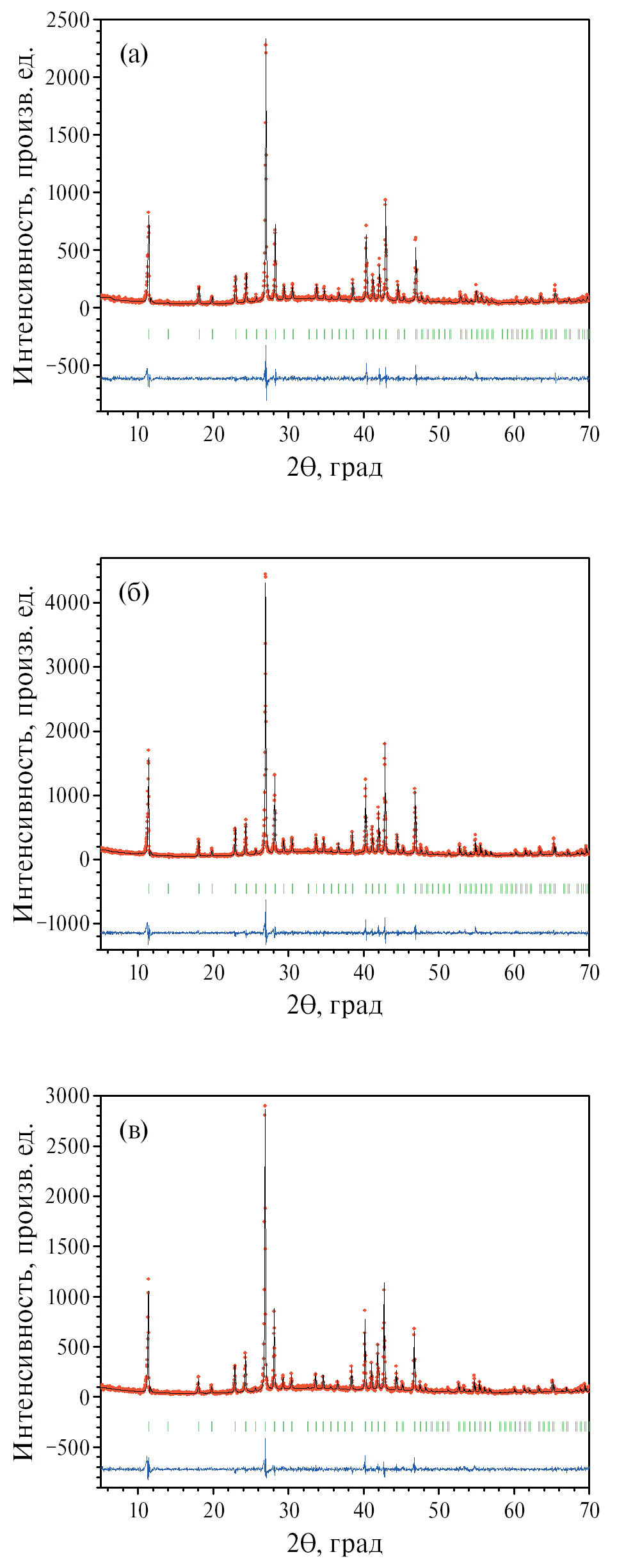 Рис. 1. Экспериментальная (точки) и расчетная (линия) рентгенограммы твердых электролитов CsAg4Br3-хI2+х, где x = 0.38 (а), 0.50 (б) и 0.63 (в). Штрихи – угловые положения брэгговских рефлексов. Внизу – разность между расчетом и экспериментом.