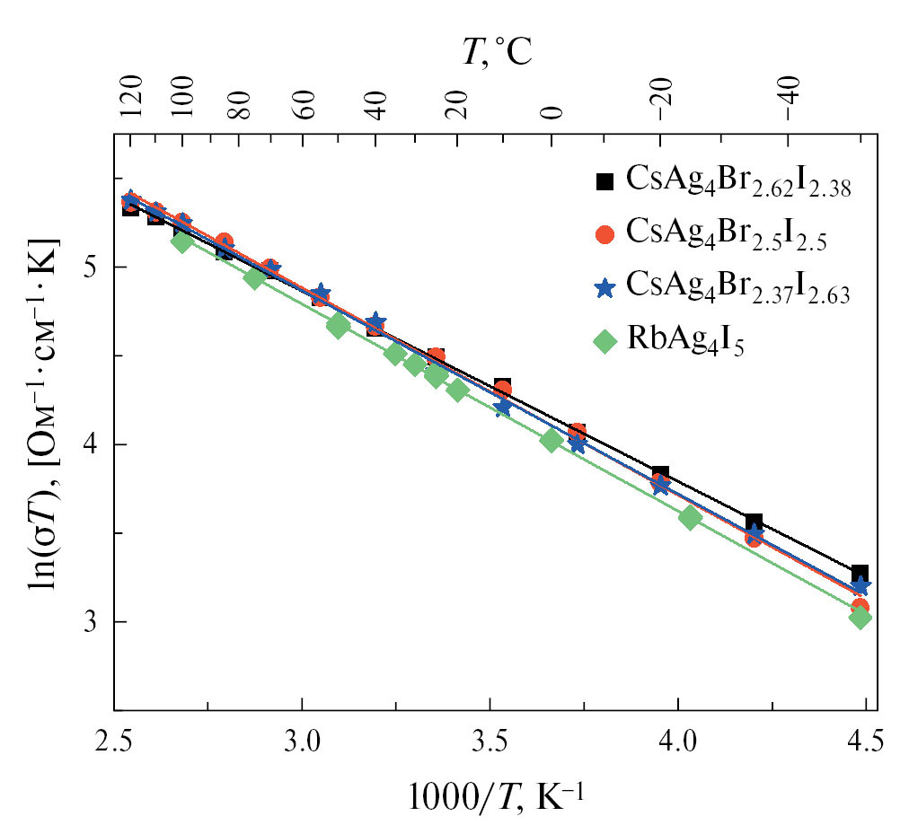 Измерения температурных зависимостей проводимости CsAg4Br3–xI2+x были выполнены на постоянном токе с использованием четыреконтактной измерительной ячейки собственной конструкции, как описано в работе [17]. Для суперионных проводников, обладающих аномально высокой по сравнению с другими материалами ионной проводимостью, измерения на постоянном токе дают более точные результаты, чем импедансная спектроскопия, поскольку это прямой метод измерения объемного сопротивления макроскопического образца. В отличие от этого, в импедансной спектроскопии используется экстраполяция частотной зависимости на бесконечную частоту при принятии некоторых априорных предположений (например, об отсутствии микронеоднородностей с разными величинами проводимости). Вторым важным фактором, влияющим на корректность результатов измерения проводимости поликристаллических образцов, являются условия приготовления керамики, определяющие ее плотность. Известно, что благодаря пластичности RbAg4I5 высокоплотную керамику из этого материала можно получить путем прессования при комнатной температуре без последующего спекания. Однако при этом давление прессования и газовая среда существенно сказываются на измеряемой величине ионной проводимости из-за влияния пористости, границ зерен и тому подобных эффектов [5, 21, 22]. По визуальным наблюдениям, порошки CsAg4Br3–xI2+x менее пластичны, чем RbAg4I5, однако они также хорошо прессуются при комнатной температуре и не требуют последующего спекания.