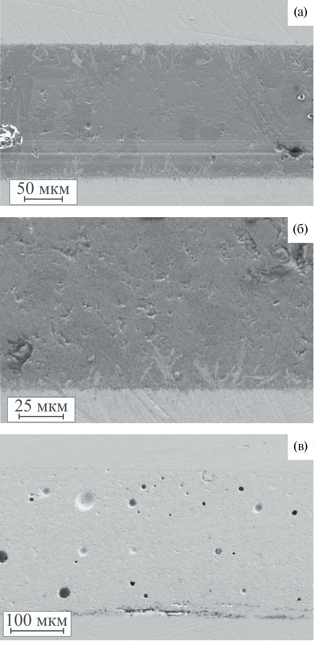 Рис. 4. СЭМ-изображения сборки сталь–герметик после обработки при 950°С в течение часа. Герметик состава 33 мол. % CaO, 21 мол. % B2O3, 46 мол. % SiO2 (а, б), коммерческий герметик Schott 394 (в).