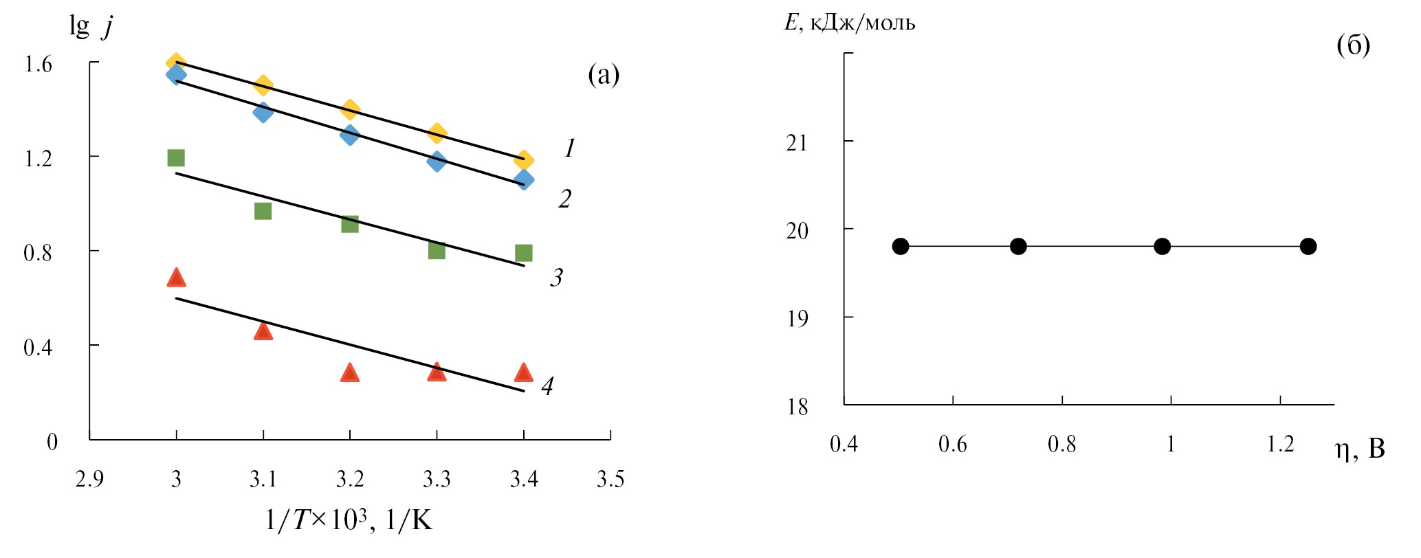 Рис. 2. Зависимости lgj от 1/Т (а) при перенапряжениях, В: 1 – 1.25; 2 – 1.00; 3 – 0.75; 4 – 0.55; и энергии активации от перенапряжения (б) для осаждения КЭП никель-кобальт-оксид алюминия в хлоридном электролите.