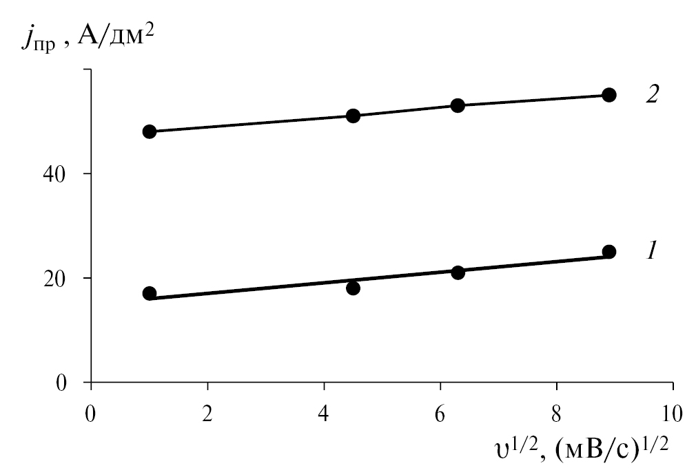 Хроновольтамперометрические кривые, полученные при разных скоростях изменения потенциала (u = 1; 20; 40 и 80 мВ/с), и построенные на их основе зависимости предельных плотностей тока jпр от скорости изменения потенциала u в степени ½ (рис. 5) свидетельствуют о смешанной кинетике, так как зависимости jпр – u1/2 не проходят через начало координат и значения jпр практически не зависят от u1/2 [21].
