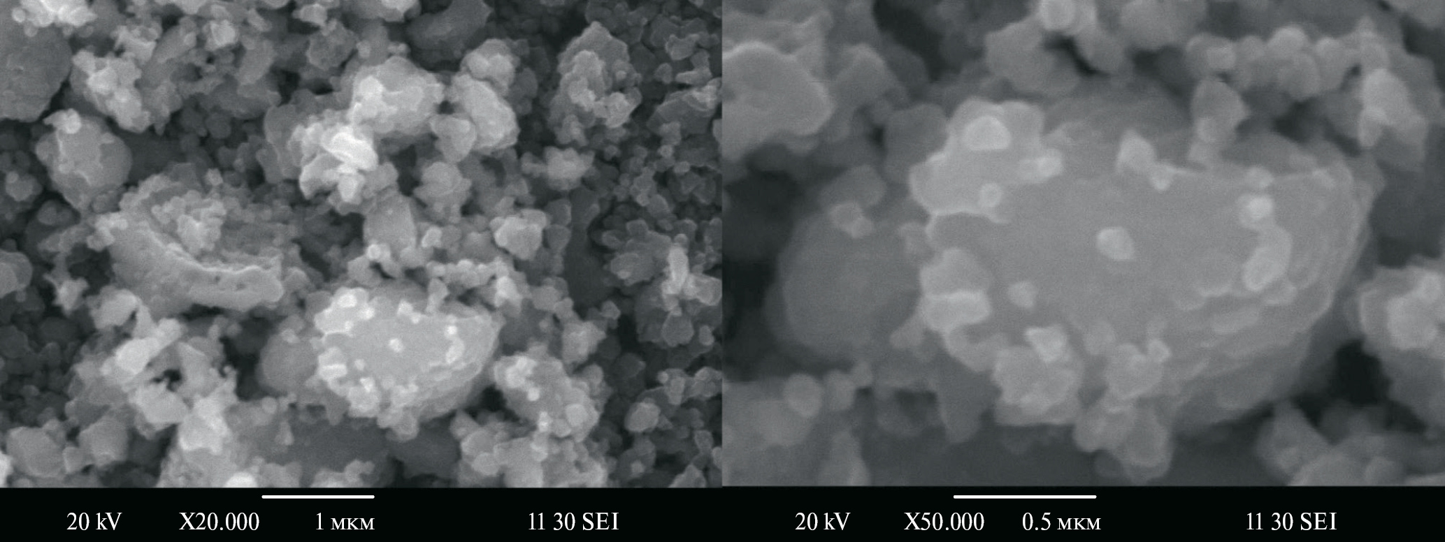 Рис. 2. Электронные микрофотографии порошка LiMn2O4 при различных увеличениях.