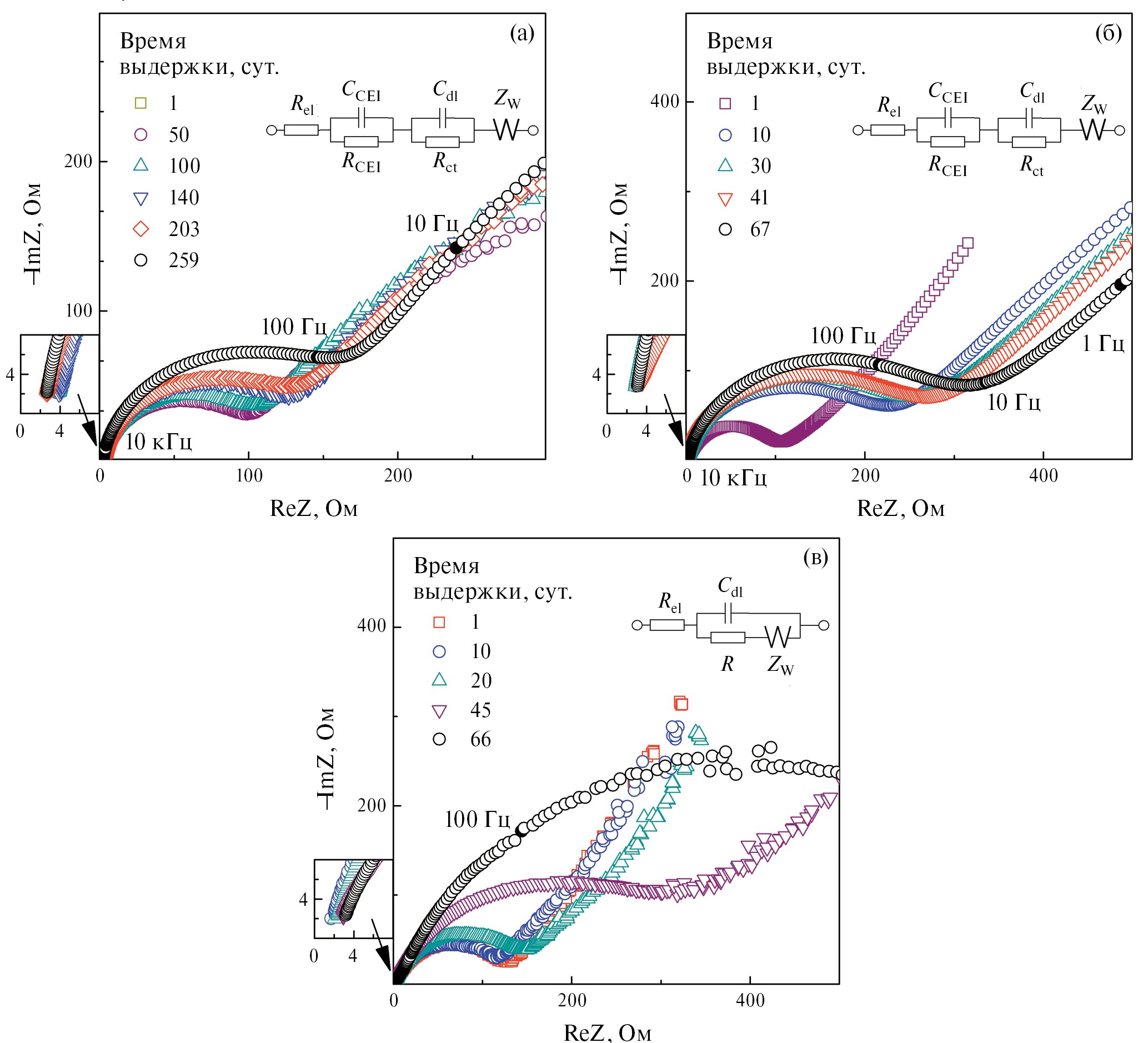 Спектры импеданса симметричных ячеек LiMn2O4│Li+│ LiMn2O4, записанные в ходе длительных изотермических выдержек в бестоковых условиях при температурах 25, 40 и 60оС, приведены на рис. 7. Они имеют характерную для электродов литий-ионных аккумуляторов форму и эволюционируют во времени. Легко увидеть, что годографы, полученные при 60°С (рис. 7в), отличаются от спектров, измеренных в других условиях (рис. 7а и 7б). Эволюция спектров во времени однозначно указывает на протекание побочных химических взаимодействий на границе электрод/электролит и позволяет предположить формирование локализованного там же слоя продуктов; деформация полуокружности позволяет допустить наложение нескольких релаксационных процессов.