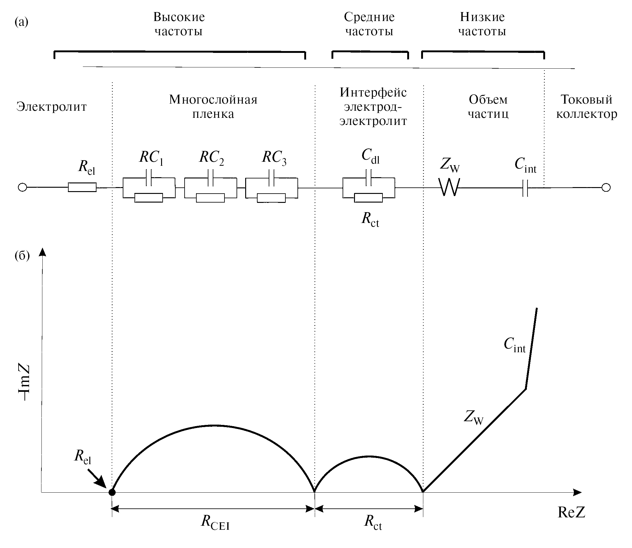 Рис. 8. Эквивалентная схема, описывающая процесс интеркаляции лития в активный материал электрода литий-ионного аккумулятора (а) и соответствующий вид годографа импеданса (б). Адаптировано из [66, 67, 69]. Rel – сопротивление электролита в сепараторе, RCEI – суммарное сопротивление интерфейсного слоя, Rct – сопротивление переноса заряда, Cdl – емкость двойного слоя на поверхности частиц активного материала, ZW – элемент Варбурга (диффузионный импеданс), Сint – емкость интеркаляции.