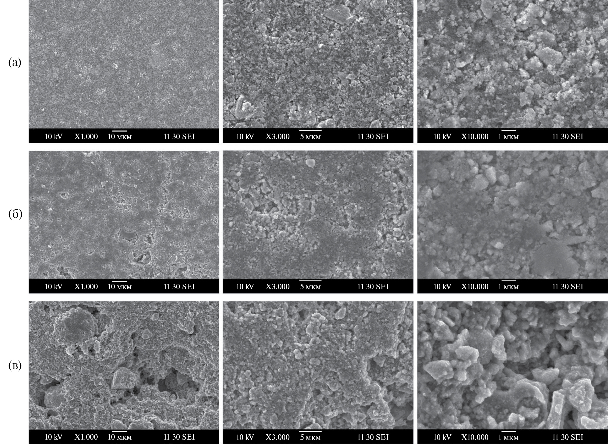 Рис. 11. СЭМ-изображения электродов на основе LMO: до взаимодействия с электролитом (а) и после измерений спектров импеданса ячеек LiMn2O4 │1 M LiPF6 в EC/DMC (1 : 1, мас.)│ LiMn2O4 в условиях длительных изотермических выдержек при 40 (б) и 60оС (в) в течение 20 сут. при различных увеличениях.