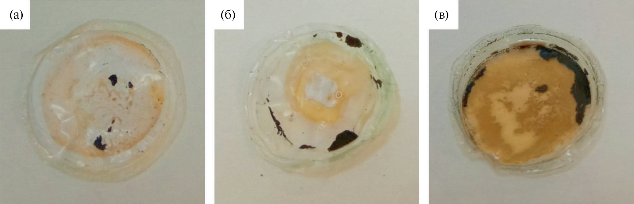 Рис. 12. Фотографии сепараторов, извлеченных из ячеек LiMn2O4 │1 M LiPF6 в EC/DMC (1 : 1, мас.)│ LiMn2O4 после измерений спектров импеданса в условиях длительных изотермических выдержек при 25 (а), 40 (б) и 60°С (в) в течение 20 сут. (черные пятна – отслоившаяся от токового коллектора электродная масса на основе LMO).