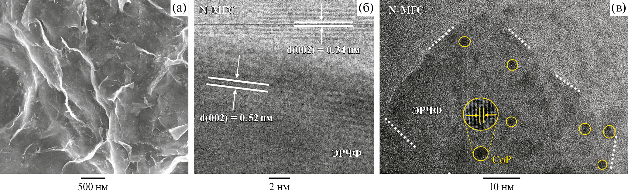 Детальное исследование морфологии поверхности полученного нанокомпозита было проведено путем анализа СЭМ- и ПЭМ-изображений (рис. 2). Было выявлено, что образец представляет собой совокупность типичных малослойных графеновых и фосфореновых структур с латеральными размерами 0.5–5 мкм и толщиной 2–7 нм. Доказательством наличия графеновых и фосфореновых структур служат существенно различающиеся величины межплоскостных расстояний 0.34 нм и 0.52 нм (см. рис. 2б), полученные для различных элементов поверхности композита, которые с очевидностью можно отнести к межплоскостным расстояниям в графите и черном фосфоре соответственно. При этом следует отметить, что фосфореновые структуры покрыты нанокристаллическими частицами сферической формы с размерами 2–5 нм, что можно увидеть на приведенном ПЭМ-изображении (рис. 2в). В согласии с литературными данными, механизм образования CoP на поверхности фосфореновых структур можно описать следующим образом. При расщеплении ЧФ на краевых участках фосфорена формируется большое количество дефектов, что приводит к тому, что атомы фосфора имеют меньшее координационное число, большее количество неподеленных электронов и, соответственно, более высокую восстановительную способность [33]. Вследствие этого на дефектных позициях ионы Co могут восстанавливаться с образованием фосфидов [34].