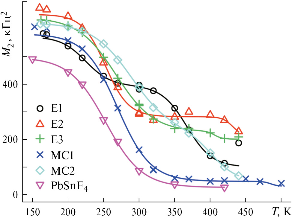Для большей части образцов можно выделить в общем случае три этапа температурной трансформации спектра ЯМР 19F (рис. 3, 4). На первом этапе, на фоне исходного асимметричного спектра в его центре тяжести регистрируется узкий симметричный сигнал, ширина которого постепенно уменьшается до 2.5–3 кГц. Температура появления узкого сигнала в спектре PbSnF4 составляет 170 K, что соответствует энергии активации 0.27 эВ. Для образцов E1 и MC1 эти температуры равны 200 и 220 K (0.32 и 0.35 эВ). Двухкомпонентная форма спектров этой группы образцов в переходной области свидетельствует о динамической неоднородности фторидной подсистемы – присутствии нескольких неэквивалентных позиций фтора в структуре образца, либо наличии фаз, энергия активации движений ионов фтора в которых различная. Следует отметить, что различия в температурах начала спектральной трансформации, достаточно заметные на спектрах, практически не отражаются на ходе температурной зависимости второго момента в области низких температур (рис. 5).