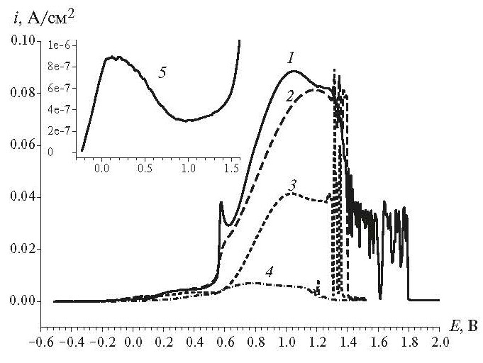 Рис. 2. Поляризационные кривые для Mn5Ge3 (1), Mn5Si3-2.85Ge2.85 (2), Mn5Si3-2.40Ge2.40 (3), Mn5Si3-0.60Ge0.60 (4) в растворе 0.5 М Na2SO4, скорость изменения потенциала 1 мВ/с. На врезке – поляризационная кривая Mn5Si3 (5) в аналогичных условиях