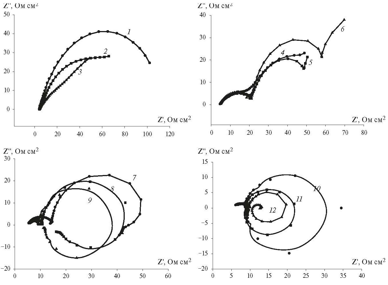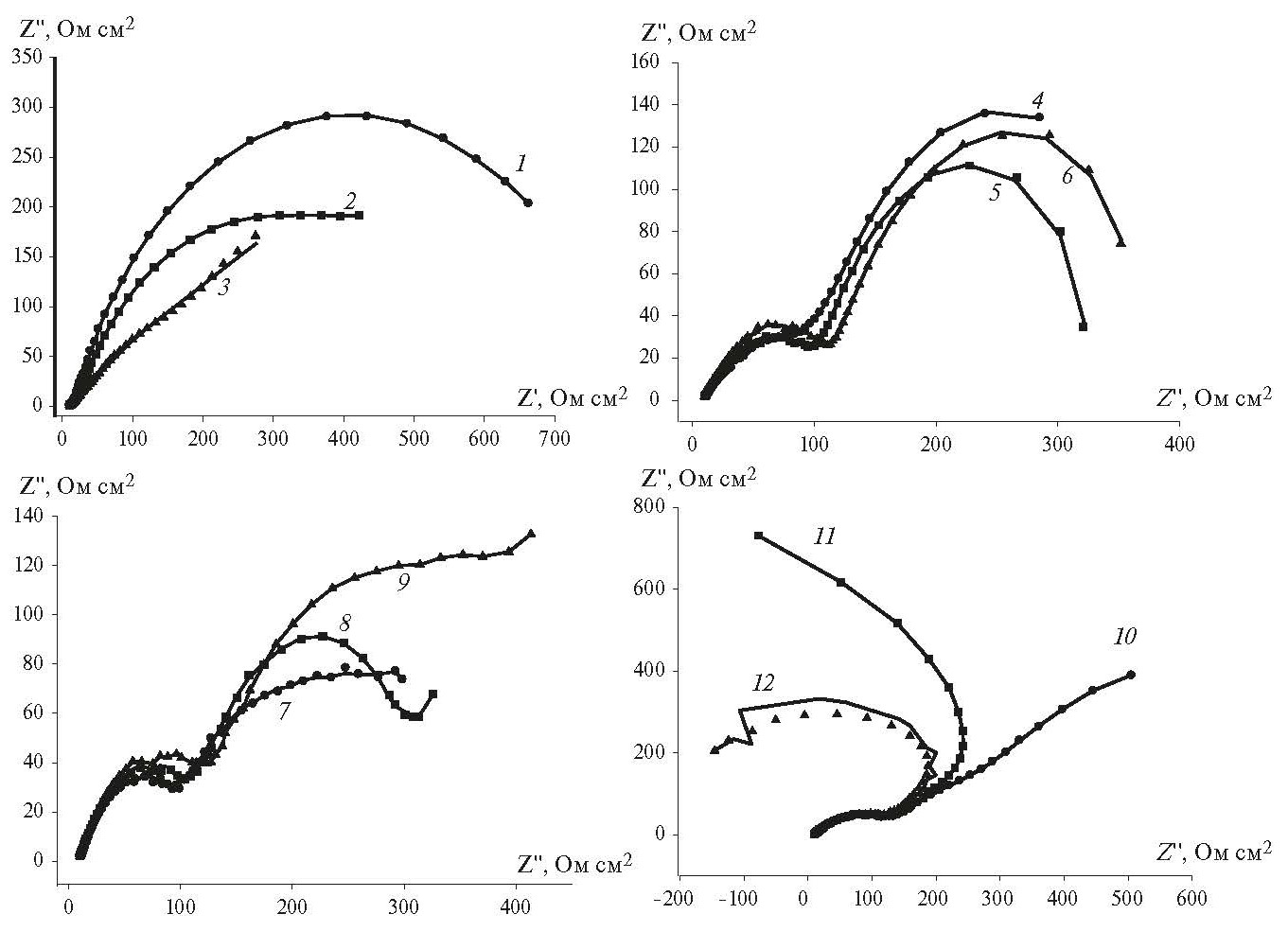 Рис. 3. Графики Найквиста для Mn5Si3-0.60Ge0.60 при анодной поляризации в 0.5 М растворе Na2SO4 при потенциалах Е, В: – 0.1 (1), 0.0 (2), 0.1 (3), 0.2 (4), 0.3 (5), 0.4 (6), 0.5 (7), 0.6 (8), 0.7 (9), 0.8 (10), 0.9 (11), 1.0 (12)