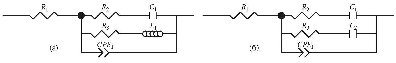 Для образца Mn5Si3-0.60Ge0.60, содержащего в себе большое количество фазы Mn5Si3, предложены две схемы, моделирующие процесс анодного растворения (рис. 5). Здесь R1 моделирует сопротивление раствора, CPE1 – емкость двойного электрического слоя с учетом шероховатости поверхности, а цепочка R2С1 моделирует сопротивление переноса заряда через межфазную границу и псевдоемкость адсорбированных на поверхности ионов. На графике Найквиста в области низких частот при E = + 0.4 В содержится скрытая индуктивная дуга, характеризующая превращение одной формы адсорбированных ионов в другую при изменении степени заполнения поверхности, поэтому схема на рис. 5б для данного годографа предполагает наличие цепочки R3L1.