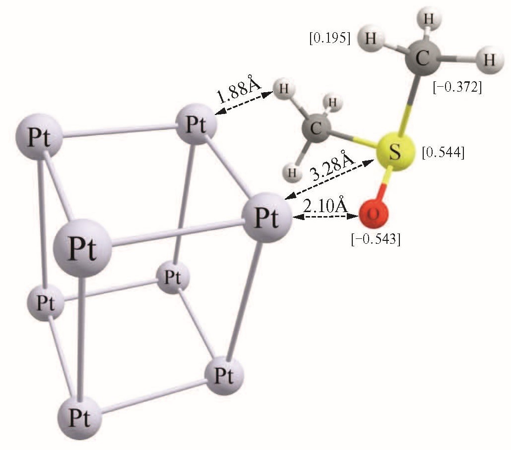 Значительный экзотермический эффект свидетельствует о хорошей адсорбции молекул ДМСО на поликристаллическом платиновом электроде в рамках кластерной модели. По квантово-химическим данным видно, что молекула ДМСО будет притягиваться к поверхности платины через атом кислорода, это можно наблюдать по межатомным расстояниям, а также атом серы может являться реакционным центром, так как склонен к окислению.