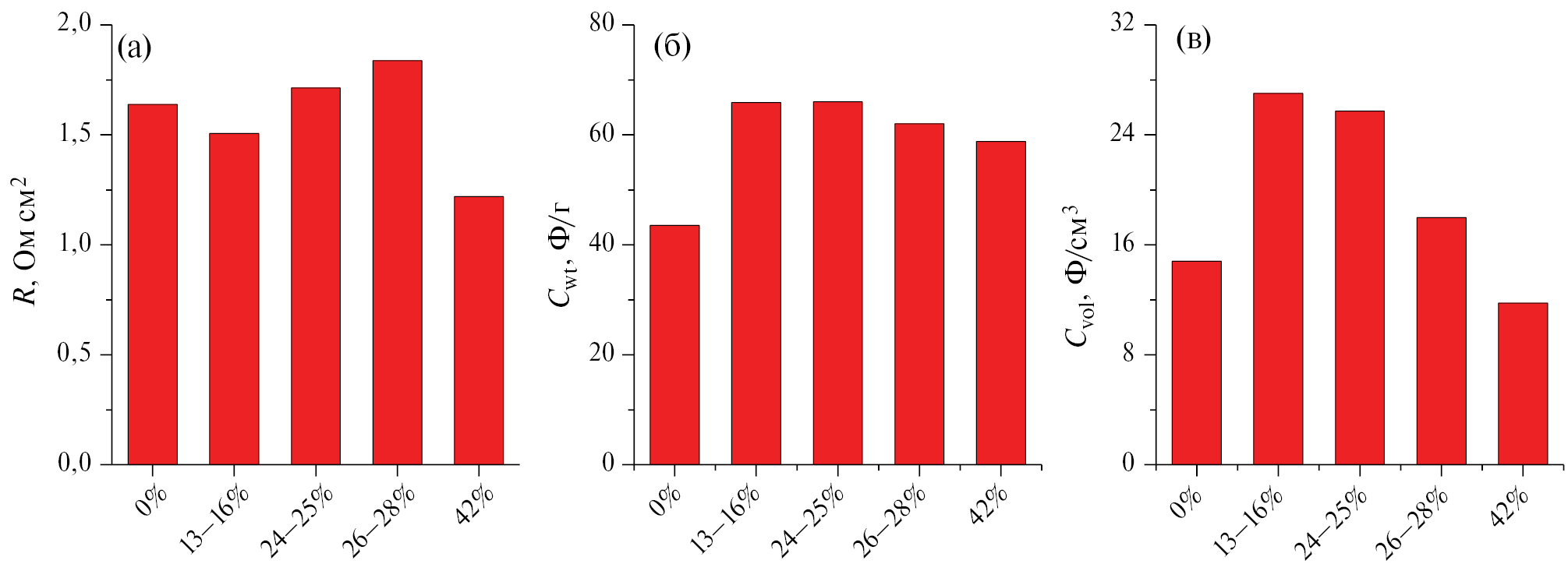 В области максимума Cvol = 26–27 Ф/см3 последовательное эквивалентное сопротивление СК с электродами из а-КУНБ RA остается достаточно малым, не более 1.5 Ом см2. При одинаковой степени активации образцов их эквивалентные последовательные сопротивления RA увеличиваются с увеличением плотности материала (№ 1, 2, 3 табл. 1). Это означает, что вклад ионной составляющей в сопротивление электродов является определяющим, и дальнейшее увеличение плотности электрода с целью увеличения удельной объемной емкости Cvol неизбежно приведет к увеличению эквивалентного последовательного сопротивления и падению мощности суперконденсатора.