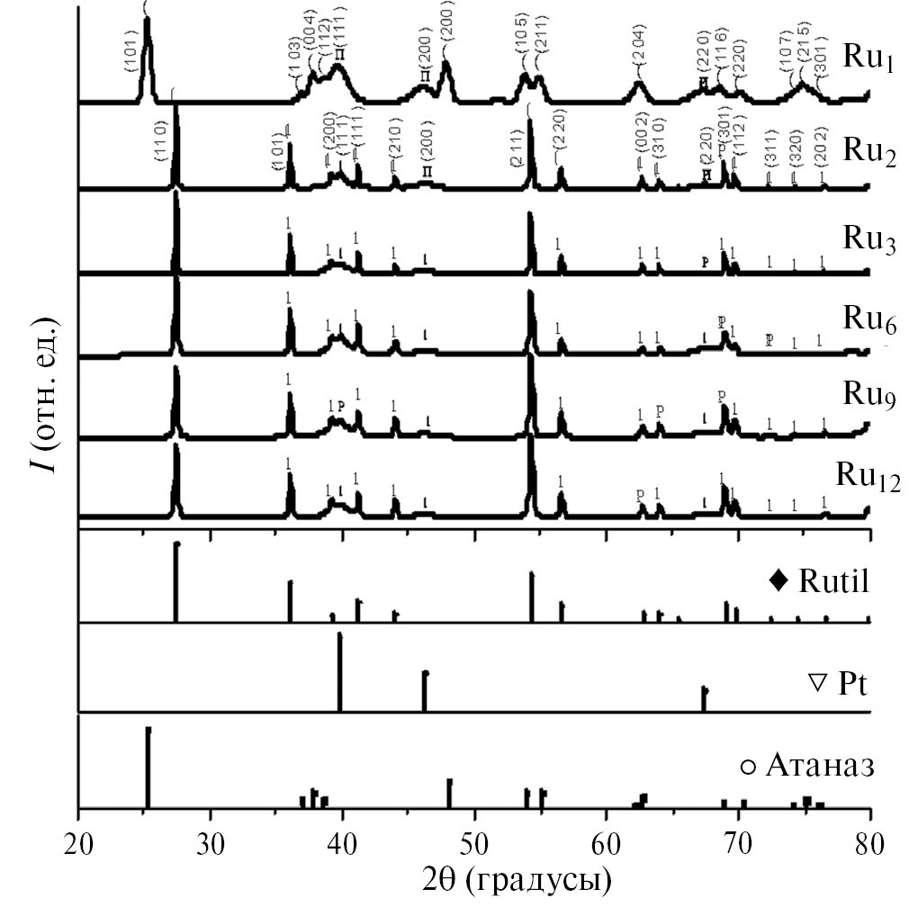 Осаждение платины на оксидный носитель производили полиольным методом путем восстановления H2PtCl6 (ч.) этиленгликолем (Sigma Aldrich), который выступал в роли растворителя и восстановителя [25]. Суспензию оксидного носителя в растворителе (1 мас. %) получали при помощи диспергатора Ultra Turrax в течение 10 мин при скорости 15 000 об/мин, затем в ультразвуковой ванне в течение одного часа. H2PtCl6 добавляли в суспензию в виде 10 мас. % раствора в этиленгликоле при перемешивании. Синтез проводили при 140°С в течение 20 мин. Осадок центрифугировали с многократной промывкой тридистиллированной водой и сушили 4 ч при 60°С. Полученные электрокатализаторы на основе платинированного TiO2(Ru) с разным содержанием рутения Rux (где х – массовое содержание диоксида рутения в носителе платины, в %; Ru0 соответствует недопированному платинированному оксиду Pt/TiO2) хранили при комнатной температуре и влажности для дальнейших исследований. Диапазон содержания диоксида рутения х выбран на основе данных фазовой диаграммы системы TiO2 – RuO2 [26]: в данной области образуются однофазные твердые растворы на основе TiO2.
