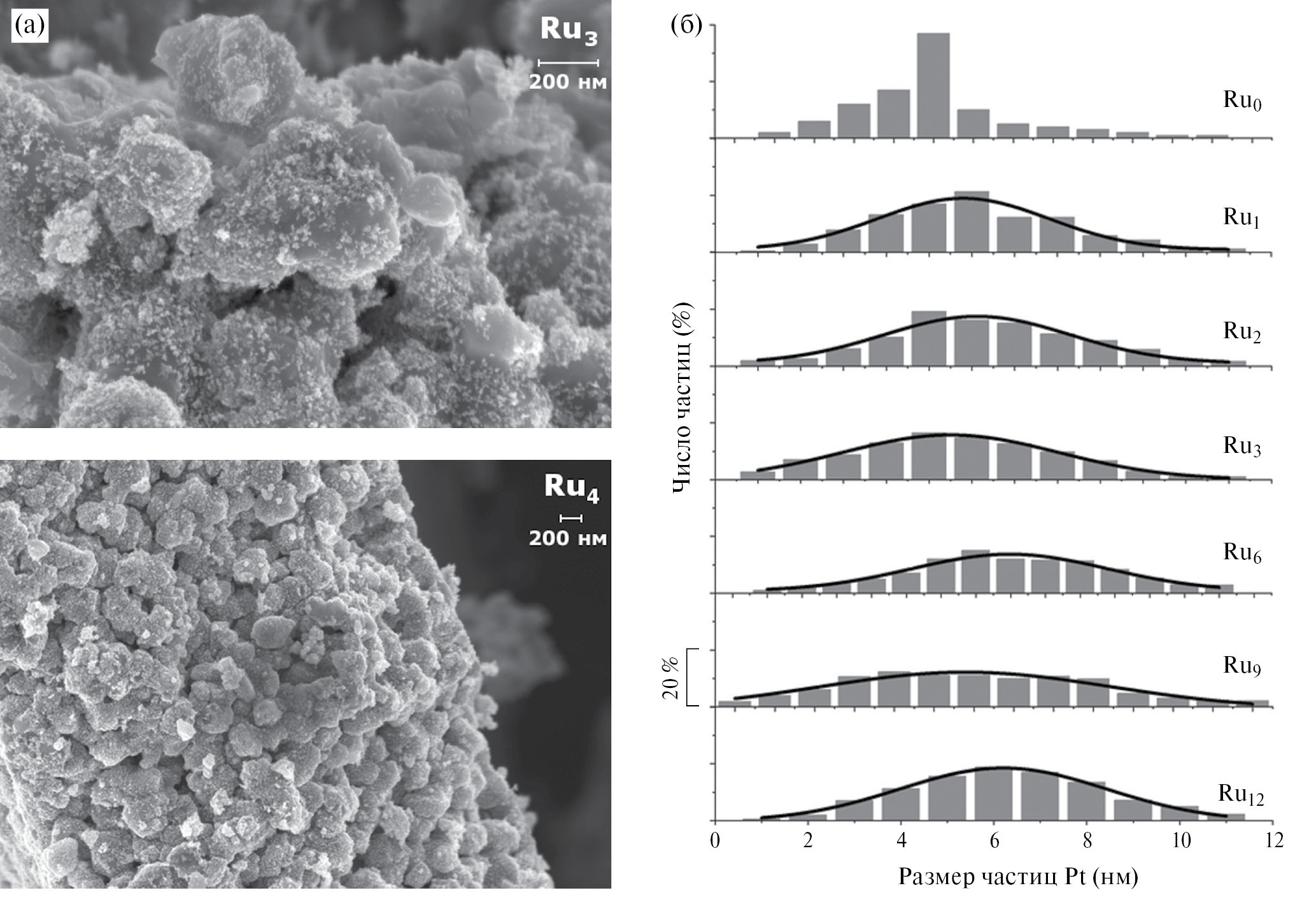 Рис. 4. Микрофотографии образцов Ru3 и Ru4 (а) и распределение частиц Pt по размерам для исследуемых электрокатализаторов Rux (б).