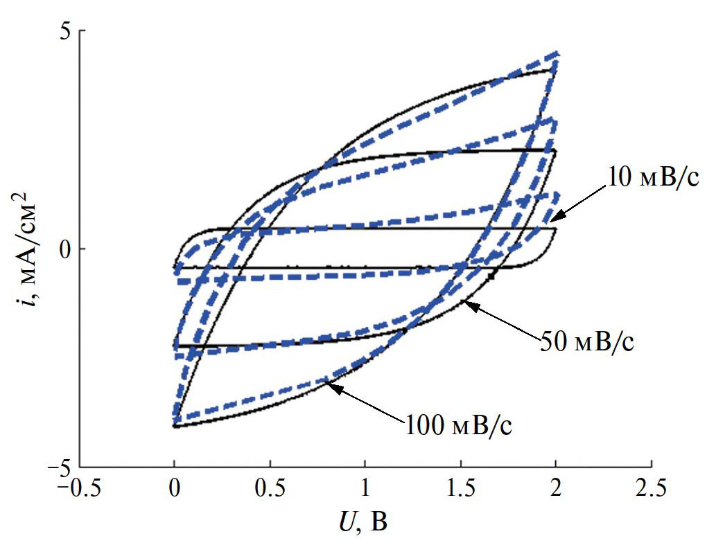 Для более детального по сравнению с гальваностатическими кривыми электрохимического анализа электродов ЭХСК, как и других электрохимических систем, измеряются циклические вольтамперограммы, т.е. зависимости тока от потенциала при заданной скорости развертки потенциала (В/с). На рис. 1 показаны схематические циклические вольтамперограммы. На верхнем рисунке (рис. 1a) изображены такие зависимости для электрода идеального ДСК, в котором происходит только заряжение – разряжение ДЭС. Эти зависимости в первом приближении представляют собой прямоугольник с прямыми линиями, параллельными и перпендикулярными оси абсцисс. На нижнем рисунке (рис. 1б) изображены схематические ЦВА-зависимости для электрода ПсК, в которые вносят вклад псевдоемкость и емкость ДЭС.