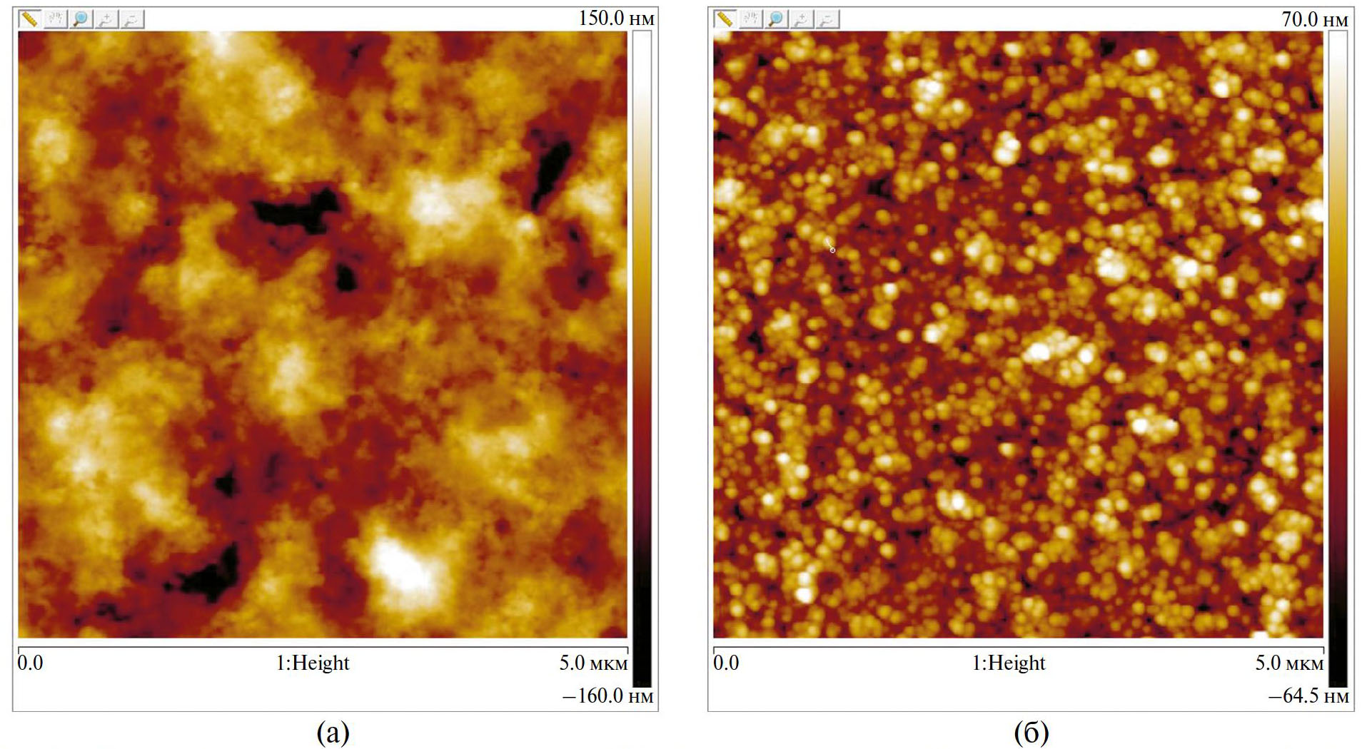 Рис. 9. АСМ-изображения поверхностей пленок ПЭДОТ, полученных на FTO-электроде, в присутствии NaFl (а) и NaClO4 (б).