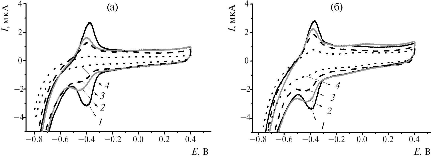 Рис. 3. Циклические вольтамперограммы, полученные на СУЭ с Азуром С, адсорбированным из ФБ, при иммобилизации нативной (а) и денатурированной (б) ДНК в концентрации, мг/мл: 1 – 0, 2 – 0.25, 3 – 0.5 мг, 4 – 1.0. 0.1 М ФБ, рН 7.0, диапазон сканирования потенциала –0.6 … 0.5 В, 0.1 В/с.