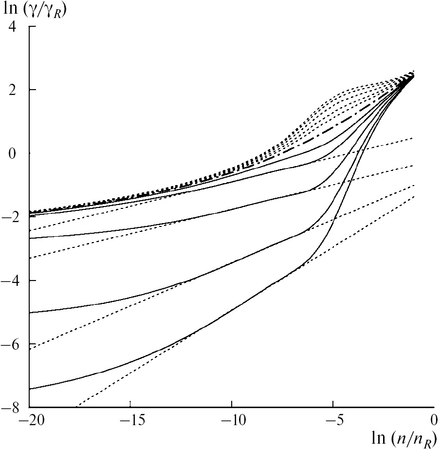 Рис. 4. Зависимость отношения γ/γR от концентрации носителей n/nR для двумерной рекомбинации с притягивающим (штриховые линии) и отталкивающим (сплошные линии) дополнительным взаимодействием и экспоненциальной корреляционной функцией c(r) = exp(–r/l) с l = 5 нм для различных значений σ, эВ: 0.05, 0.07, 0.1, 0.13 и 0.15;T = 300 К, R = 1 нм, ε = 3. Пунктирная линия с точками показывает случай отсутствия беспорядка. Линии, расположенные ближе к этой линии разделения, соответствуют меньшим значениям σ. Пунктирные прямые линии показывают область, где γ ∝ ns.