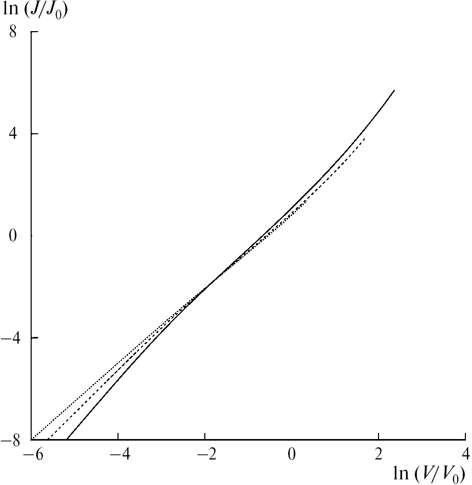 Рис. 6. ВАХ для случая равных подвижностей и также γ = γ0 ns для s = 1 (пунктирная линия) и s = 2 (пунктирная линия). Сплошная кривая соответствует трехмерной рекомбинации. K = 1, Gs = 1, E0 = 1 × 105 В/см и T = 300 К. Для L = 1µ и типичных значений соответствующих параметров V0 = 1–10 В.