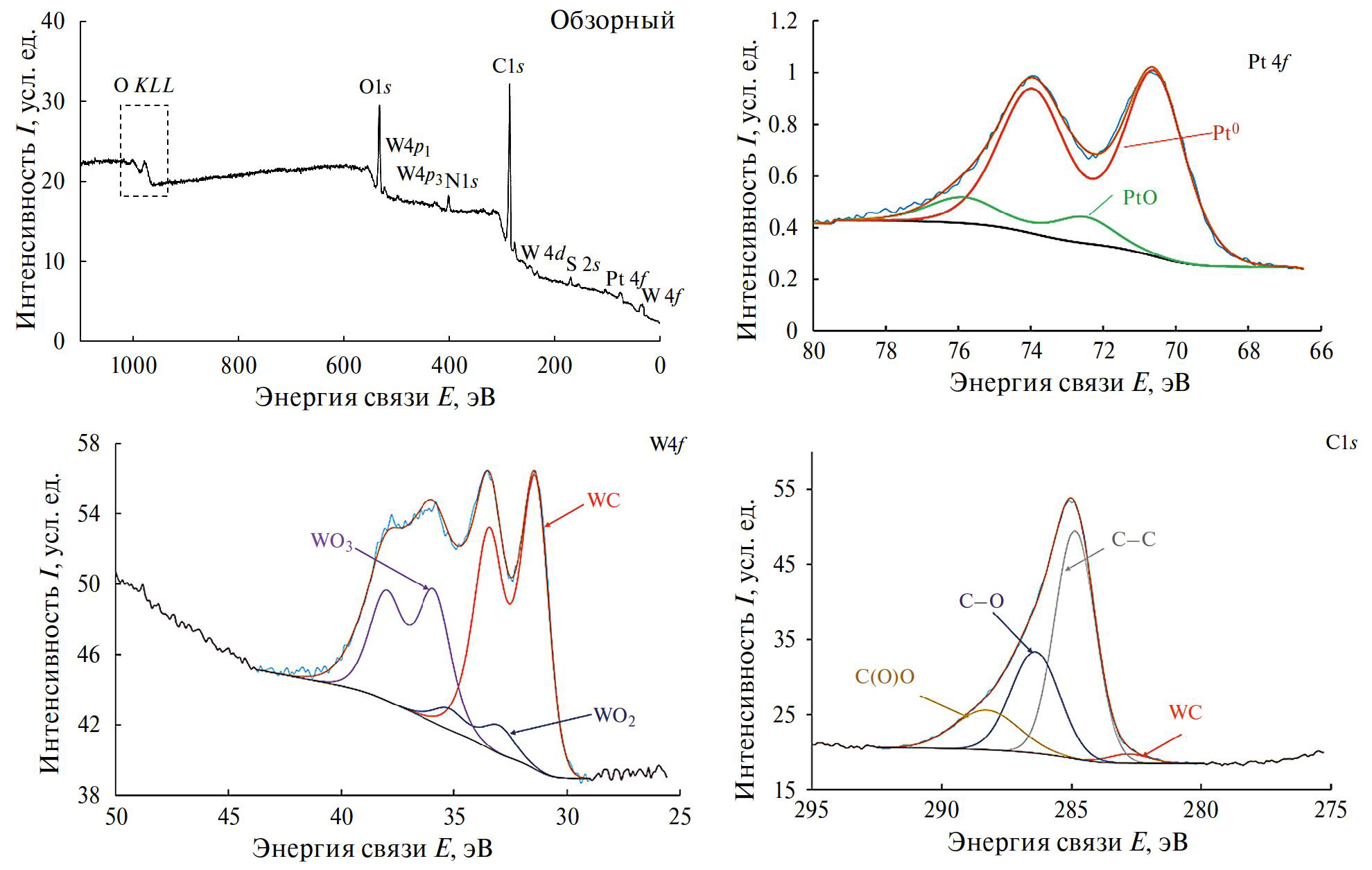 На поверхности образца фиксируются оксиды вольфрама, из которых преобладает WO3, что подтверждает правомерность вывода о преимущественном маршруте окисления карбида вольфрама по реакциям (4) и (5), заметны также значительные количества непрореагировавшего карбида вольфрама. Углерод на поверхности образца присутствует как в неокисленном (WC), так и в окисленных (С–O, C(O)O) состояниях. C–C-связи содержатся в молекулах адсорбированных из воздуха органических загрязнителей. Учитывая высокое значение коэффициента прилипания углерода на платине, наличие таких загрязнителей в образцах, подвергаемых исследованиям ex situ, неизбежно.