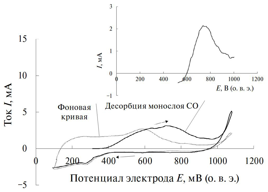 Электрохимически активную поверхность платины (EASA) определяли по величине заряда, затраченного на десорбцию монослоя монооксида углерода [45, 46]. Накопление монослоя СО проводили в 0.5 М растворе H2SO4 при потенциале 0.3 В, пропуская через него оксид углерода(II) в течение 10 мин. Затем для удаления растворенного CO через рабочий раствор пропускали аргон “ос.ч.” в течение 20 мин, после чего потенциал рабочего электрода сканировали в анодном направлении со скоростью 5 мВ/с.